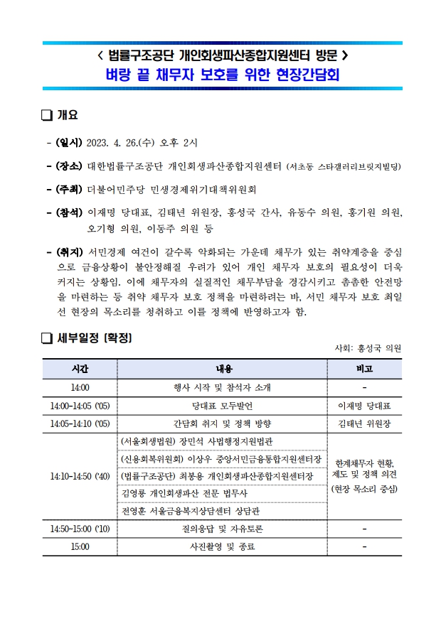 [보도자료] 더불어민주당 민생경제위기대책위원회, 민주당, 한계채무자 보호를 위한 현장간담회 개최