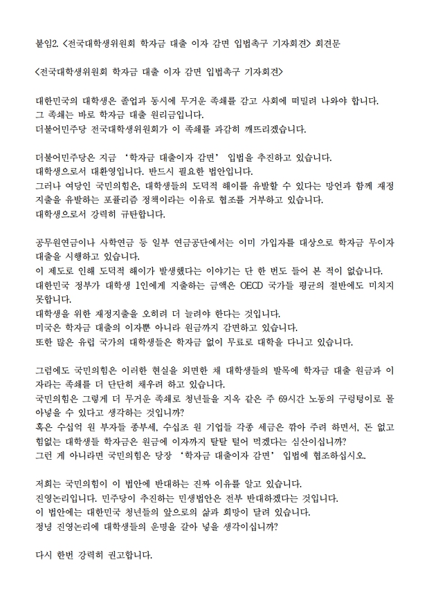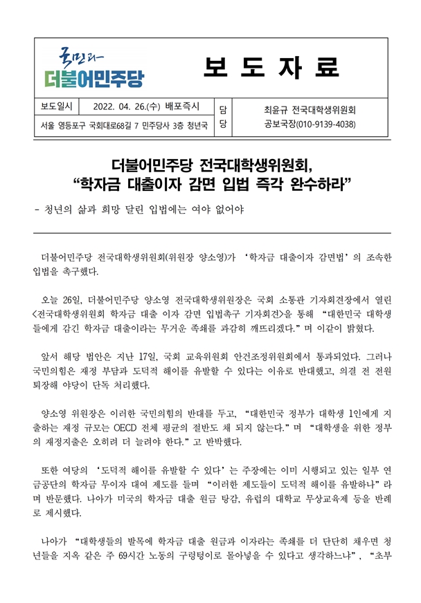 [보도자료] 더불어민주당 전국대학생위원회, “학자금 대출이자 감면 입법 즉각 완수하라”