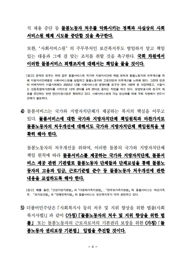 [보도자료] 민주연구원, '민생회복 프로젝트' 연속토론회 제8차 돌봄노동자 분야 토론 결과에 대한 언론브리핑