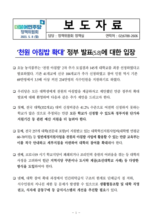 [보도자료] 더불어민주당 정책위원회, '천원 아침밥 확대' 정부 발표(5.8)에 대한 입장