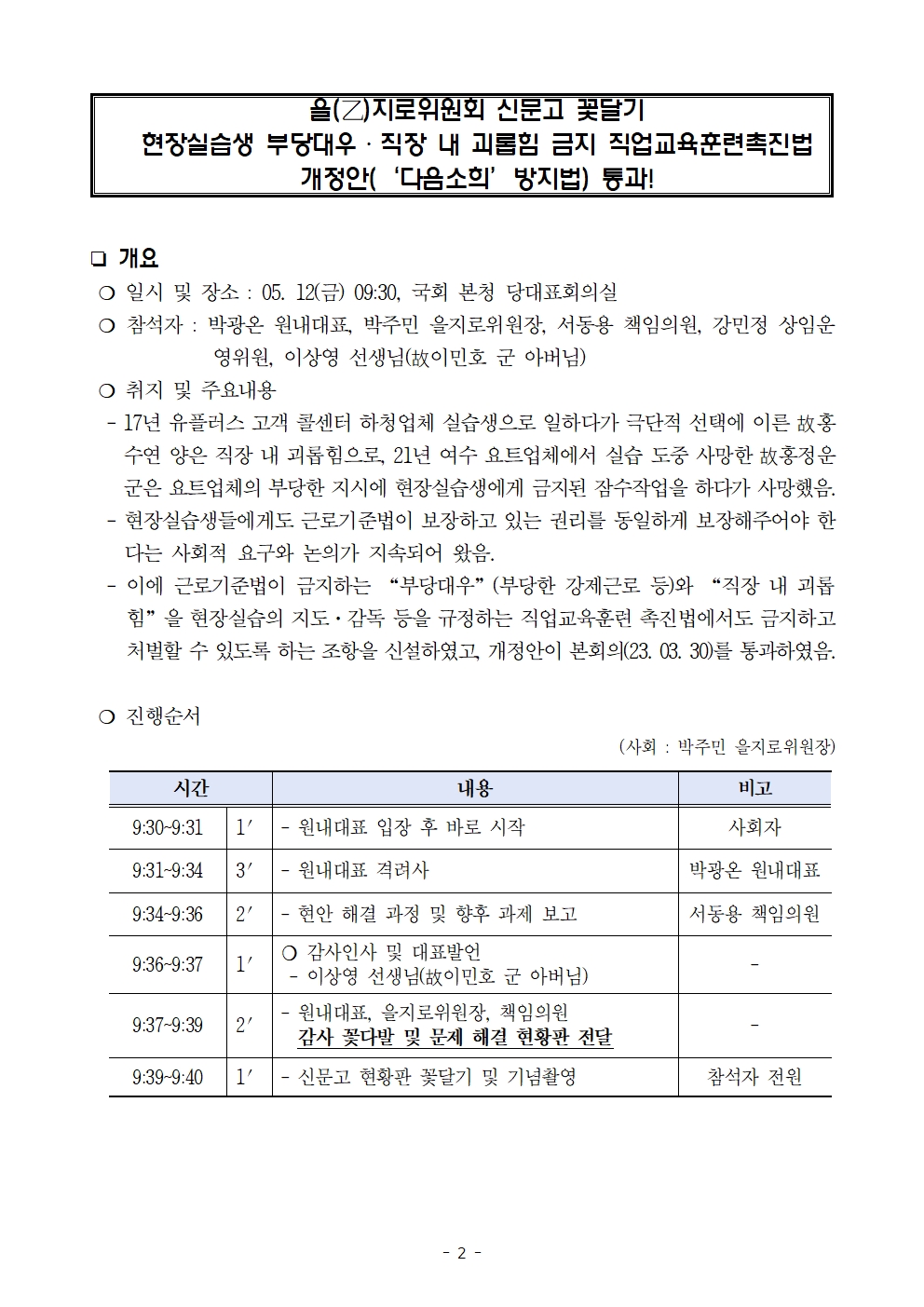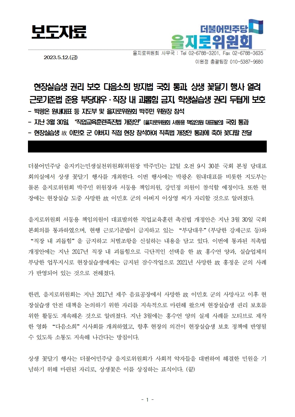 [보도자료] 더불어민주당 을지로위원회, 현장실습생 권리 보호 다음소희 방지법 국회 통과, 상생 꽃달기 행사 열려
