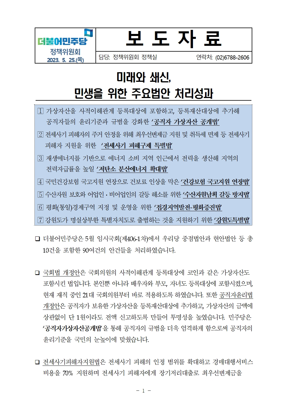 [보도자료] 더불어민주당 정책위원회 5월 임시국회 입법성과