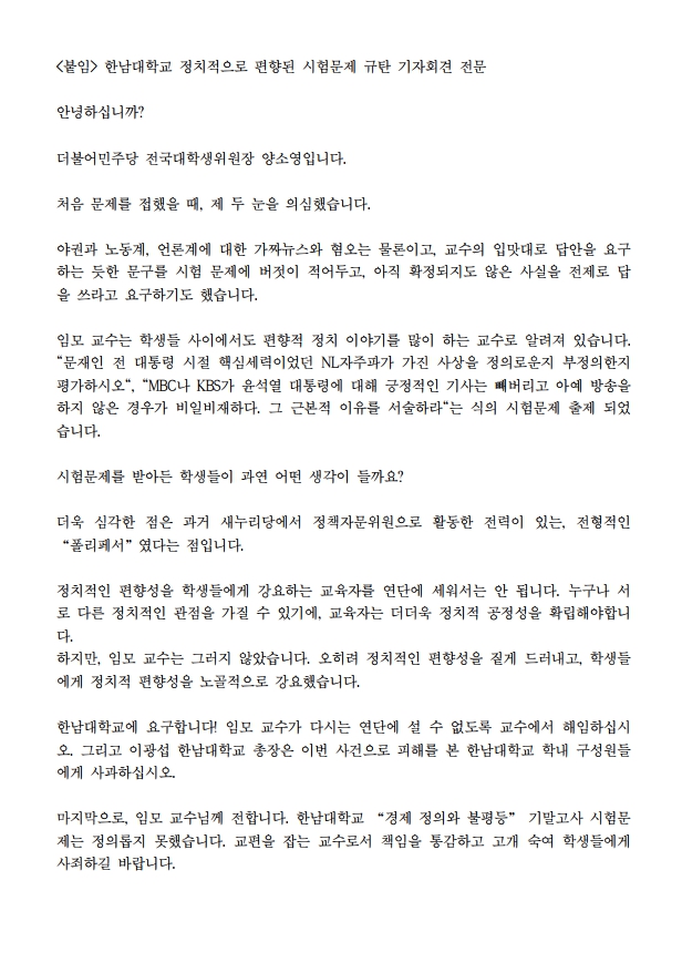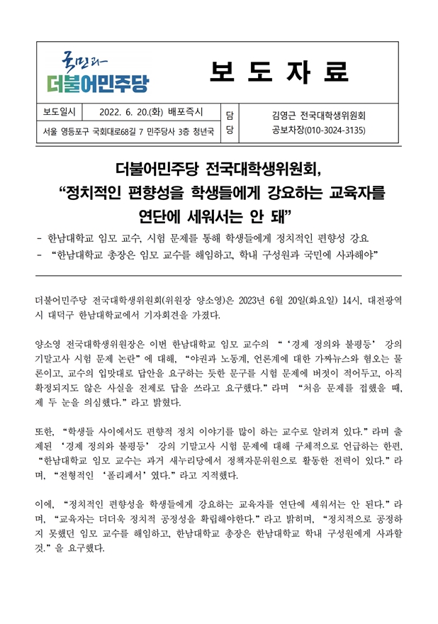 [보도자료] 더불어민주당 전국대학생위원회, “정치적인 편향성을 학생들에게 강요하는 교육자를 연단에 세워서는 안 돼”