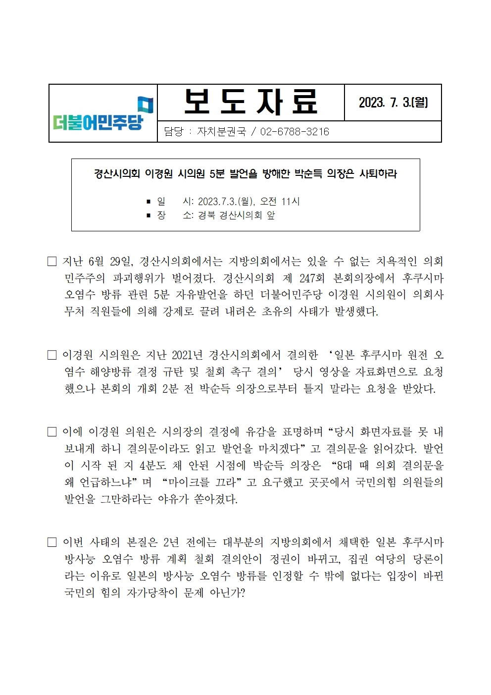 [보도자료] 경산시의회 이경원 시의원 5분 발언을 방해한 박순득 의장은 사퇴하라