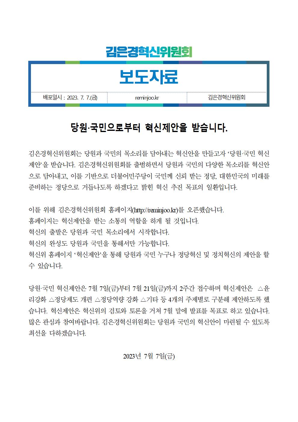 [보도자료] 김은경혁신위원회, 당원‧국민으로부터 혁신제안을 받습니다.