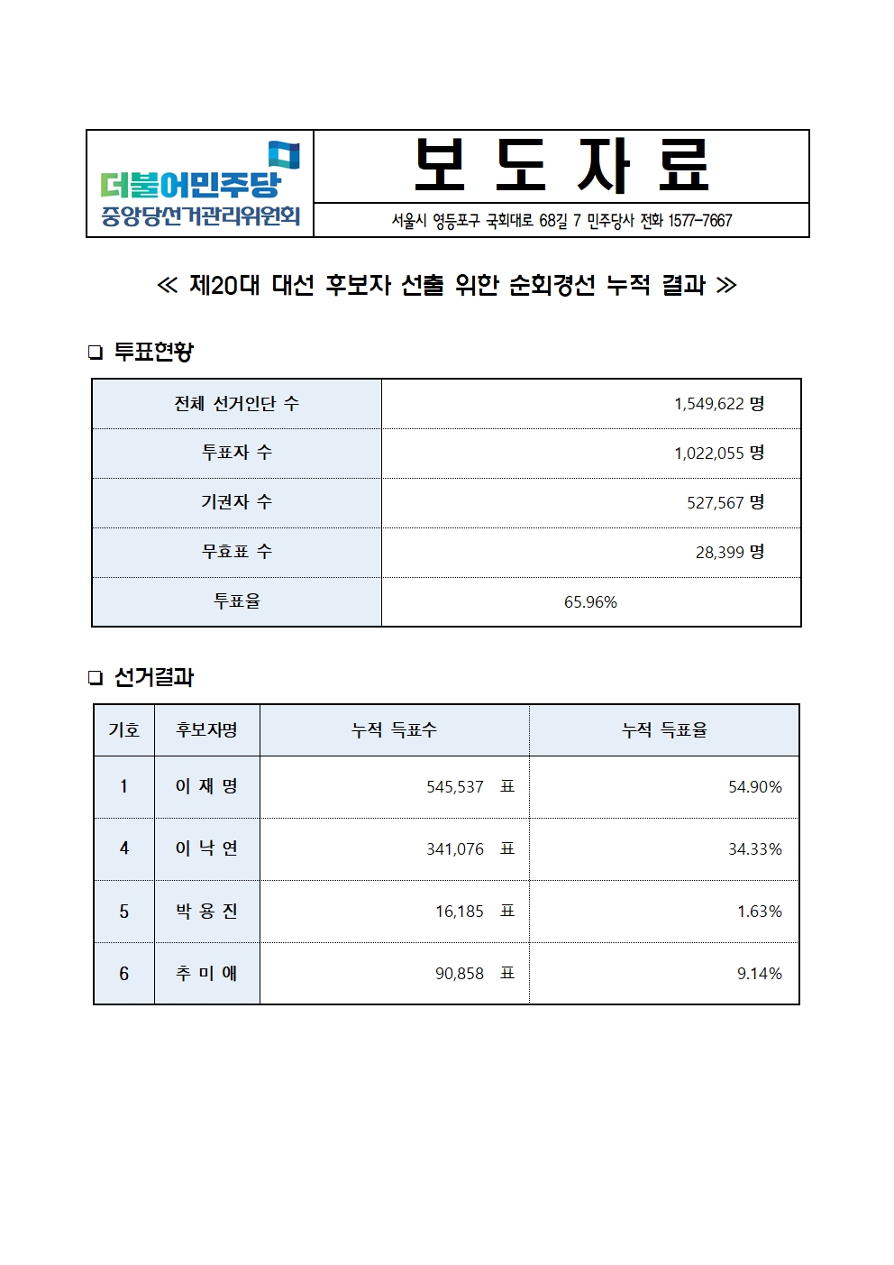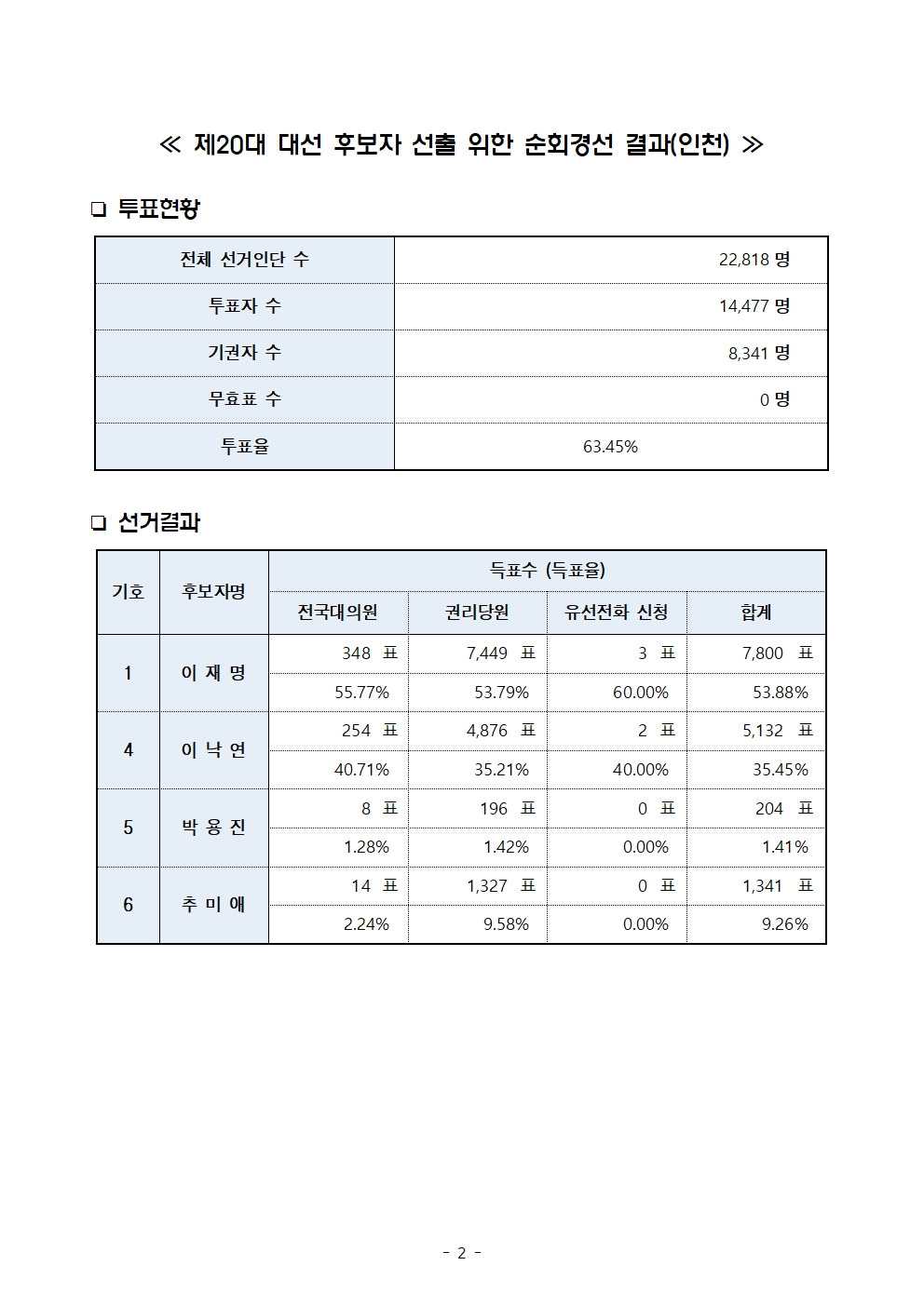 [보도자료] 인천 제20대 대선 후보자 선출을 위한 순회경선 결과