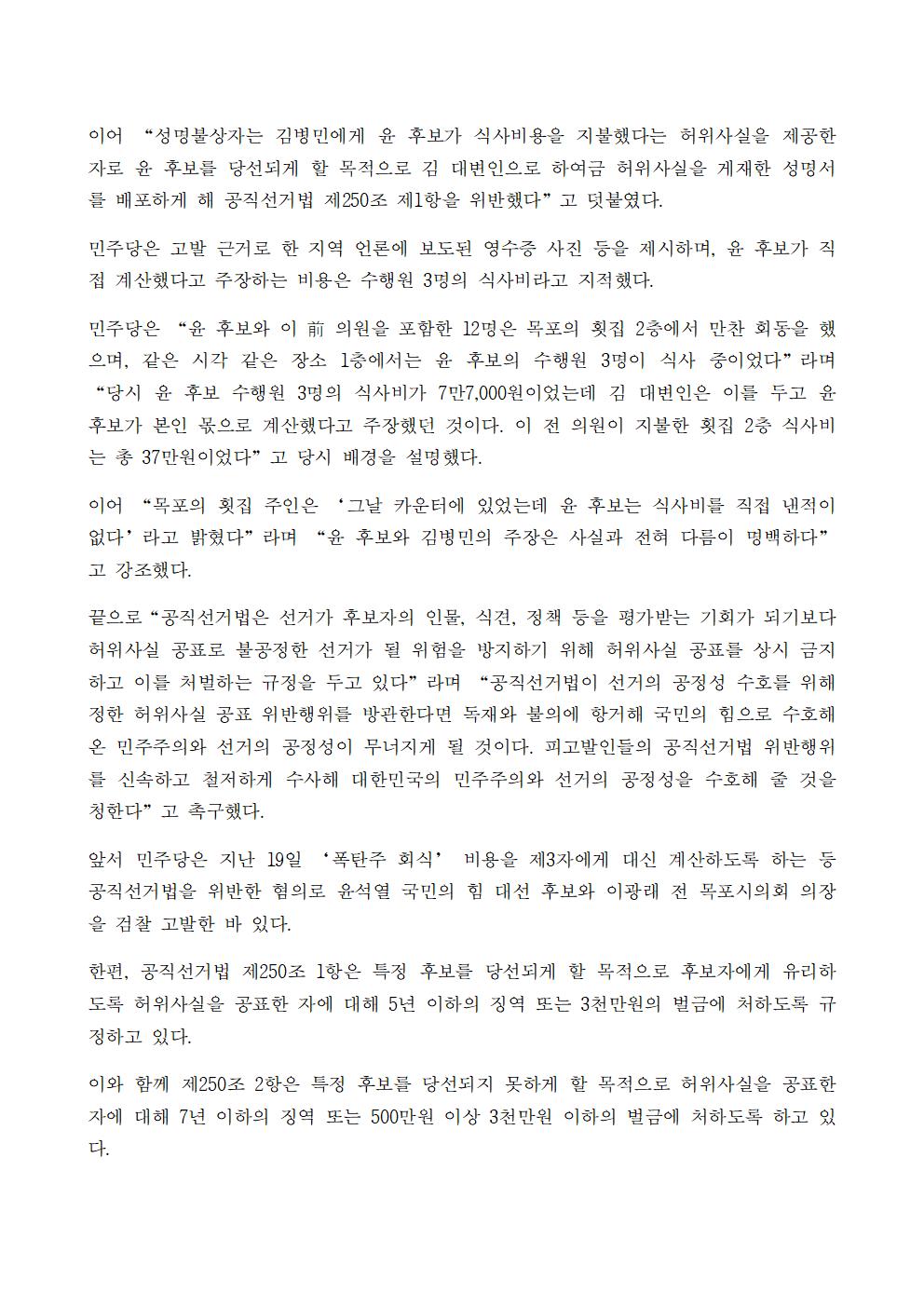 [보도자료] 김병민 국민의힘 대변인 허위사실 공표 공직선거법 위반 검찰 고발