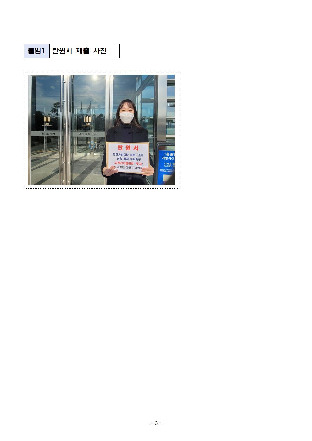 [보도자료] 더불어민주당 선대위 법률지원단, 이병철-이민구 등 시민단체 대표 2명 구속 수사 촉구 탄원서 제출