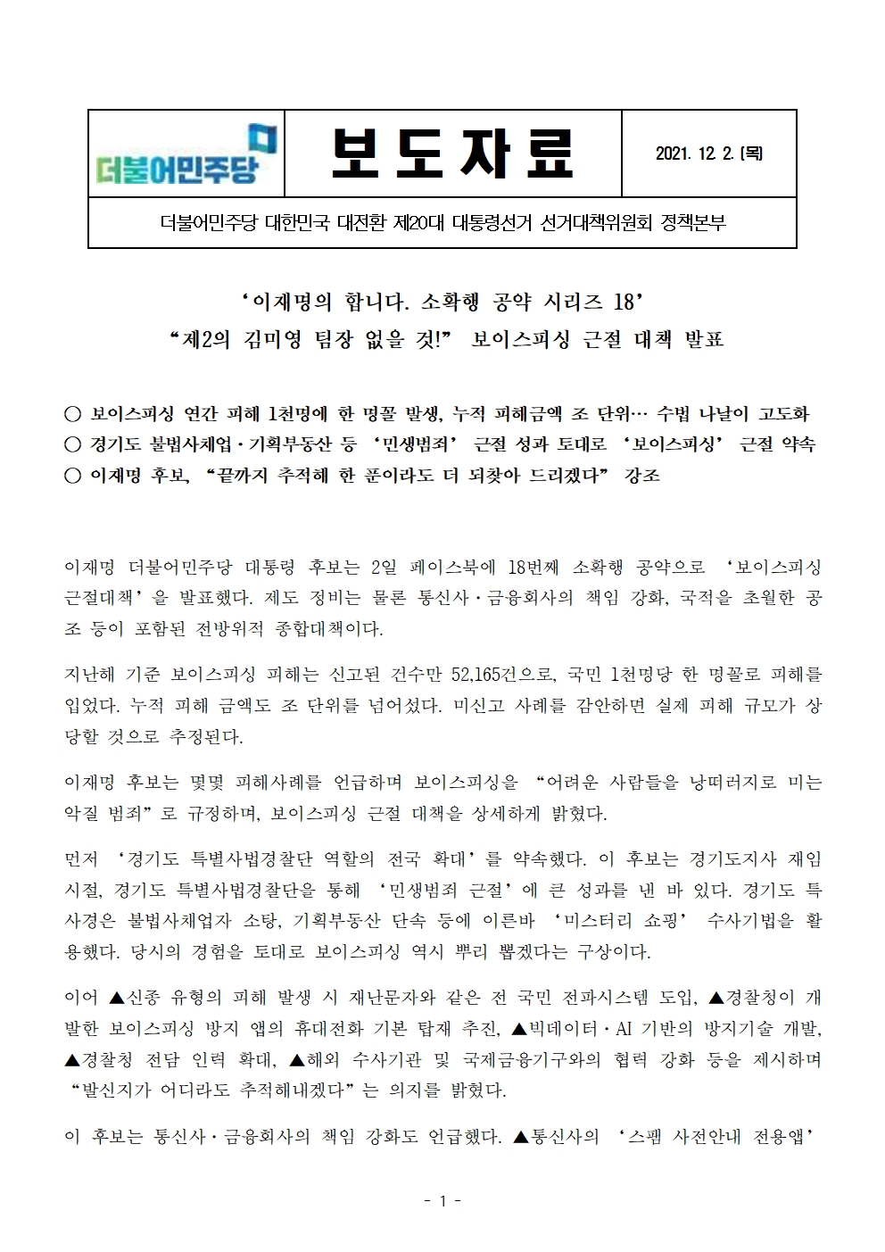 [보도자료] 더불어민주당 선대위 정책본부, '이재명의 합니다. 소확행 공약 시리즈 18' 보이스피싱 근절 공약