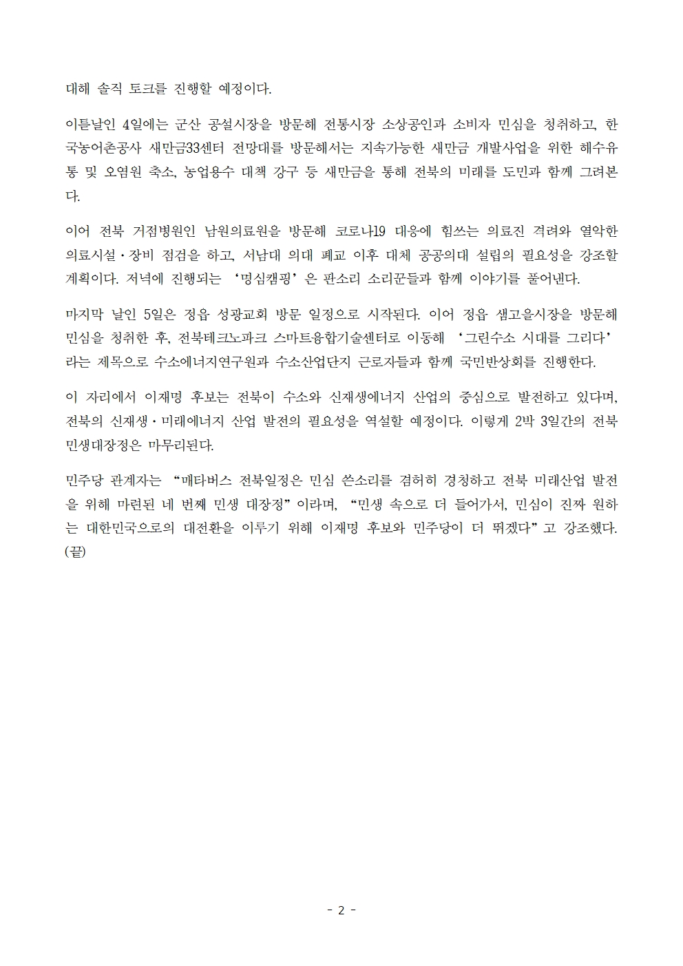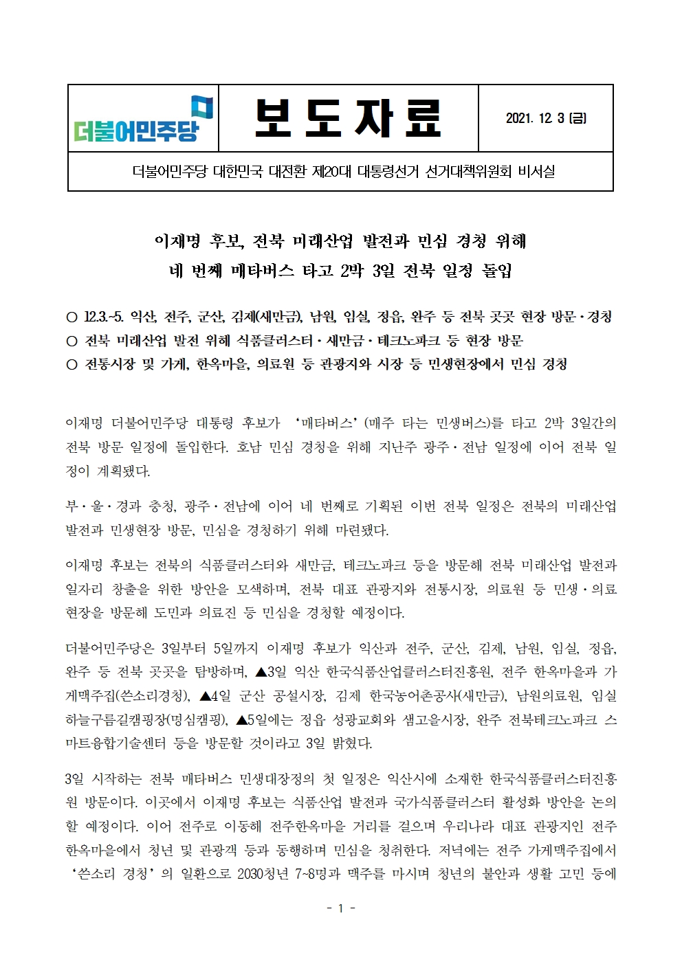 [보도자료] 이재명 후보, 전북 미래산업 발전과 민심 경청 위해 전북 매타버스 2박 3일 일정 돌입