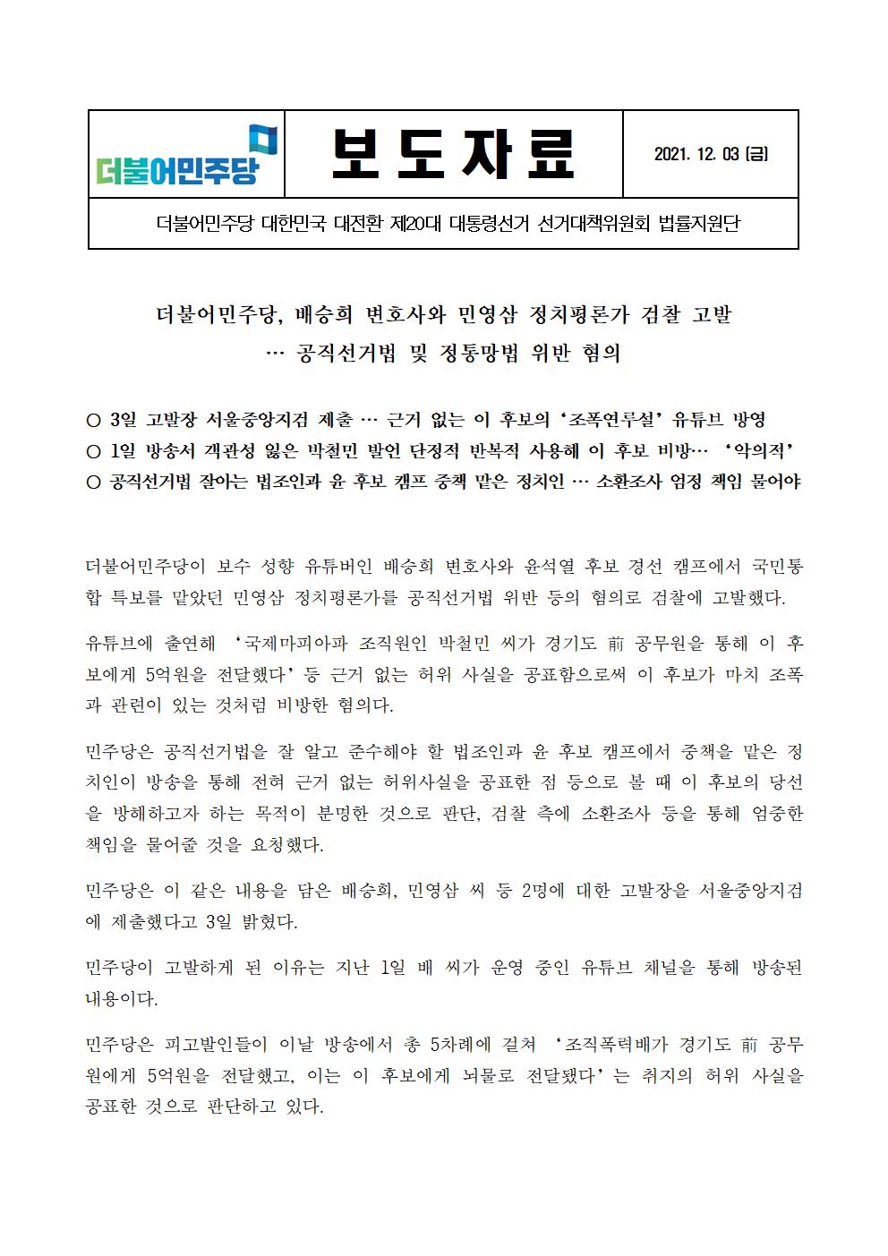 [보도자료] 더불어민주당 선거대책위원회 법률지원단 배승희 변호사 민영삼 정치평론가 검찰 고발