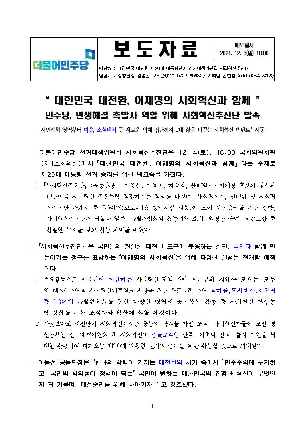 [보도자료] 더불어민주당 선거대책위원회 사회혁신추진단 발족