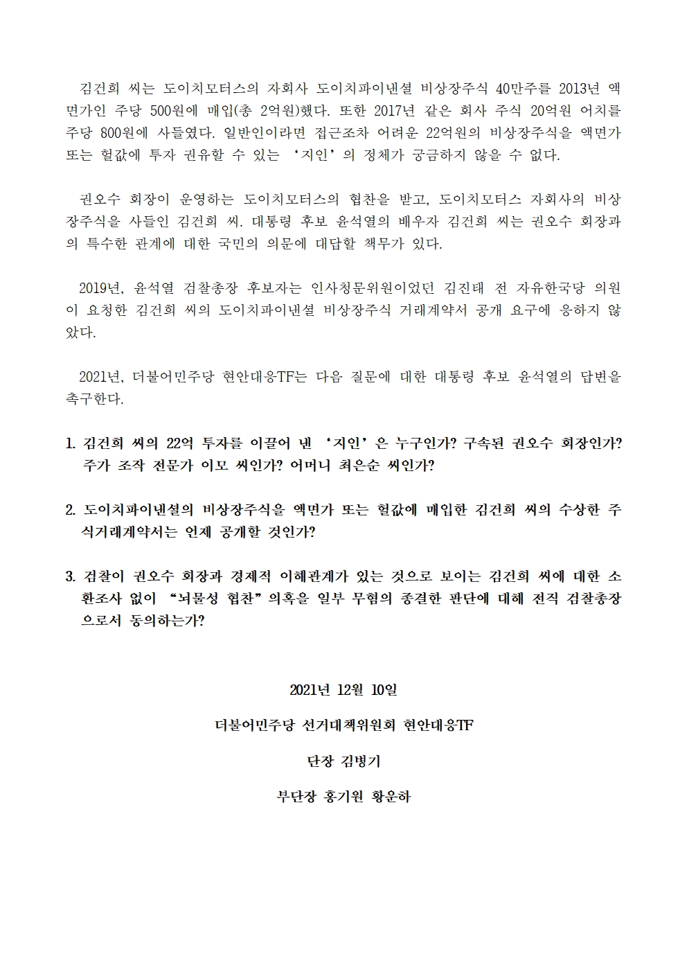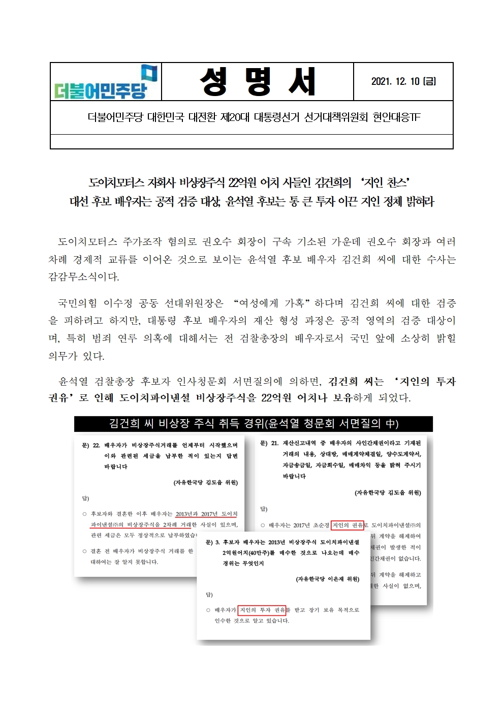 [성명서] 더불어민주당 선대위 현안대응TF, 도이치모터스 자회사 비상장주식 22억 원 어치 사들인 김건희의 '지인 찬스'. 윤석열 후보는 지인 정체 밝혀라