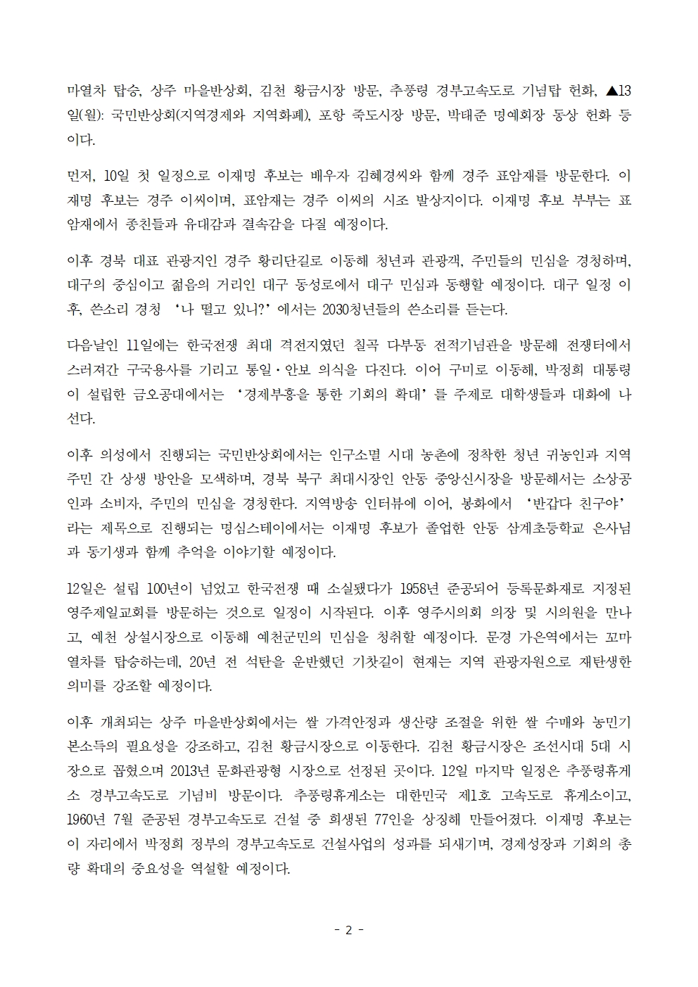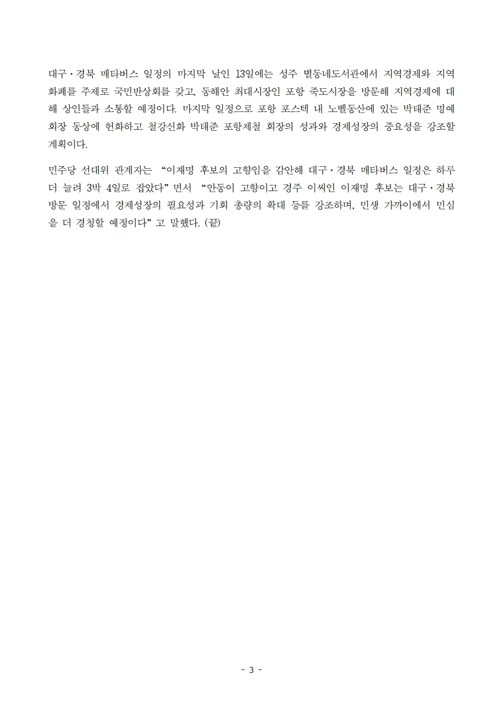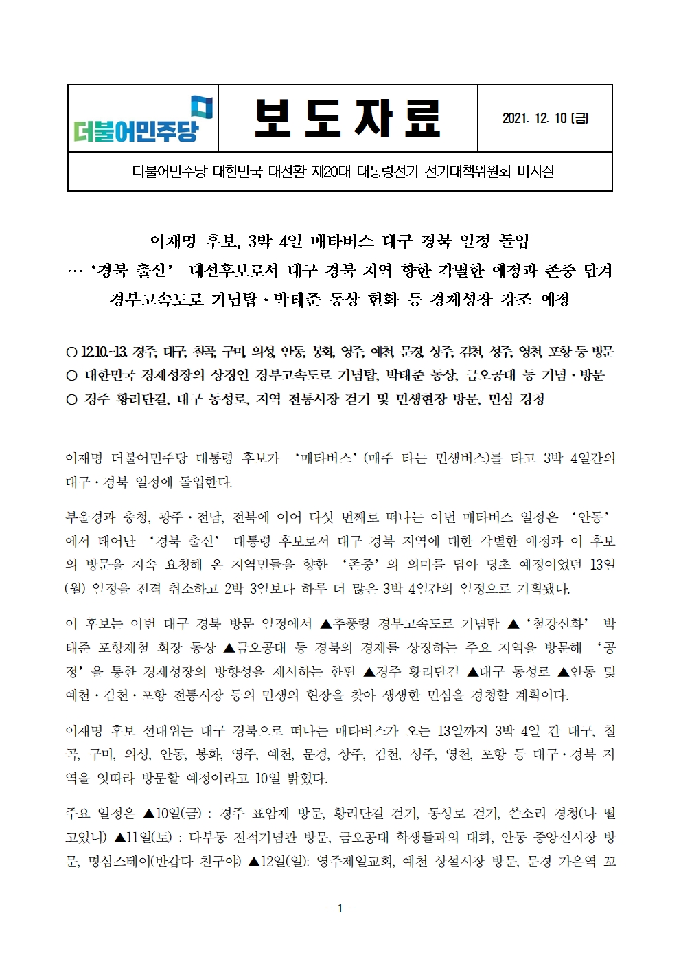 [보도자료] 더불어민주당 선대위 비서실, 이재명 후보, 3박 4일 매타버스 대구 경북 일정 돌입