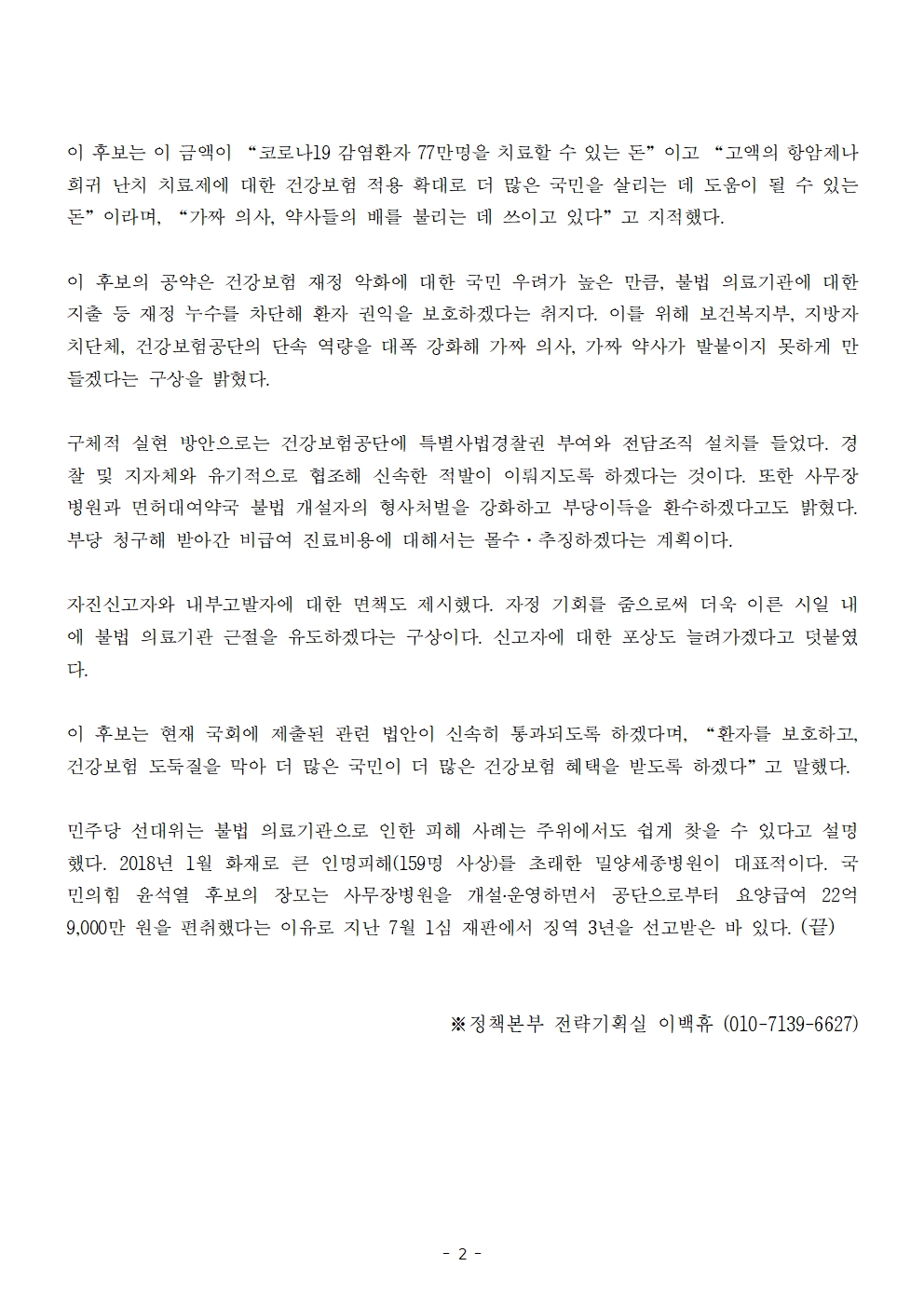[보도자료] 더불어민주당 선대위 정책본부, '이재명의 합니다. 소확행 공약 시리즈 23' 불법 사무장병원 · 면허대역약국 근절 공약