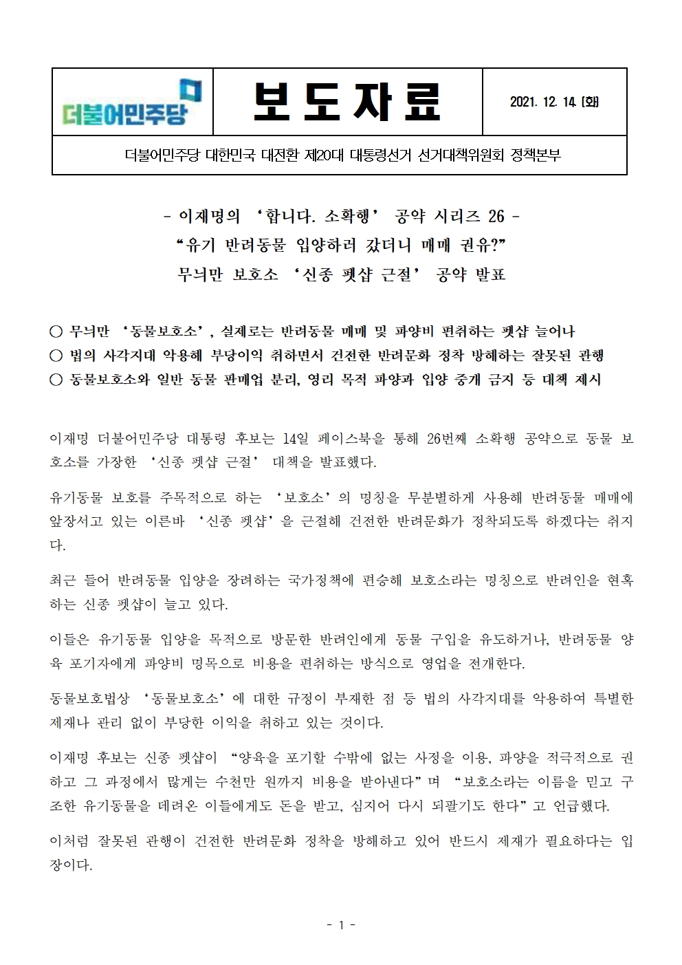 [보도자료] 더불어민주당 선대위 정책본부, '이재명의 합니다. 소확행 공약 시리즈 26' 신종 펫샵 근절 공약