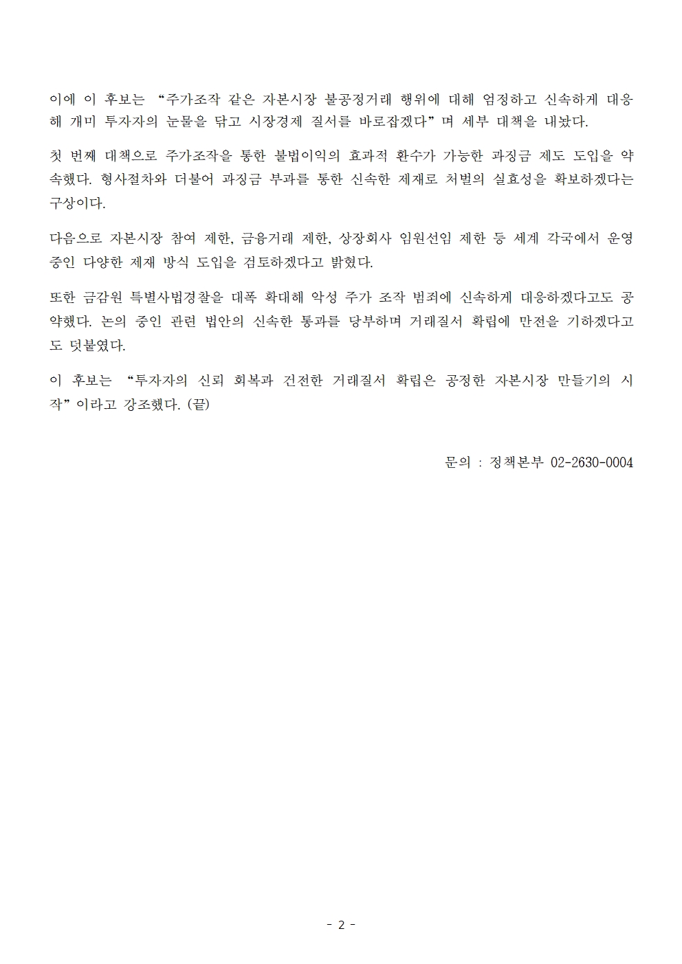[보도자료] 더불어민주당 선대위 정책본부, '이재명의 합니다. 소확행 공약 시리즈 27' 주가조작 근절 공약 발표