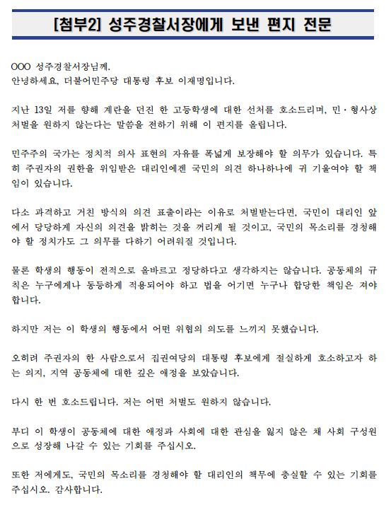 [보도자료] 더불어민주당 선대위, 이재명 후보, 계란 투척 고등학생에 편지 보내