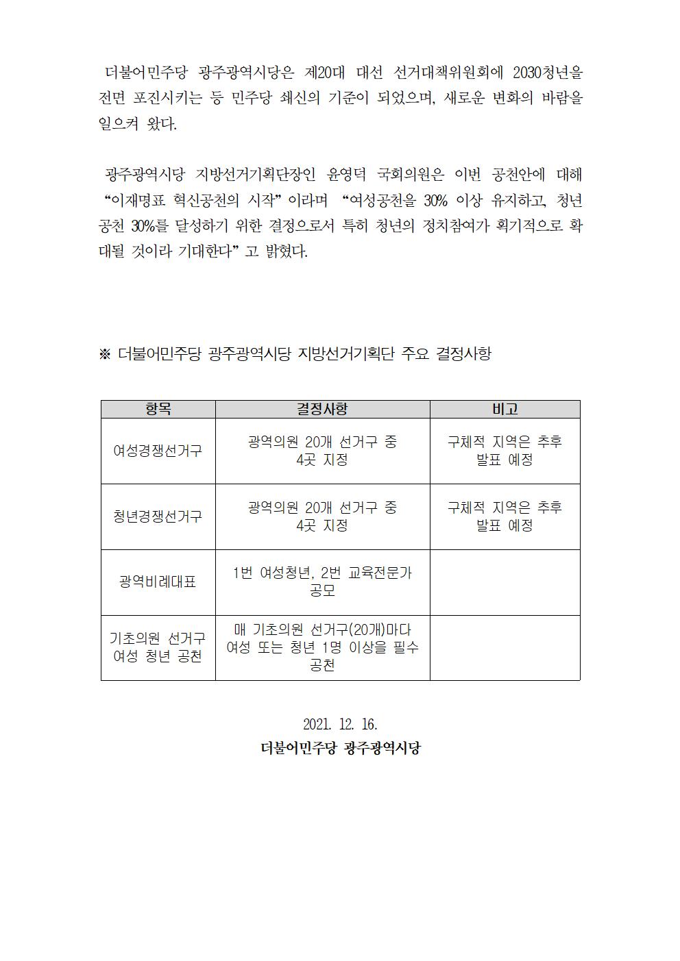 [보도자료] 더불어민주당 광주시당, 지방선거기획단 주요결정 사항