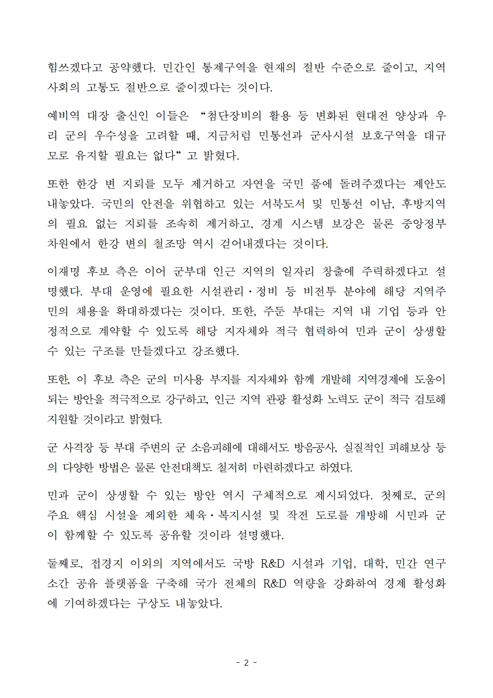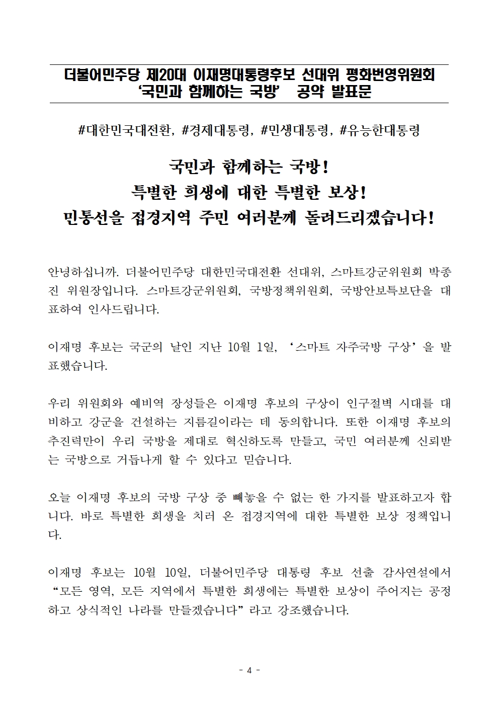 [보도자료] 더불어민주당 선대위 평화번영위원회, 접경지역 및 군부대 주변 주민 보상 공약 발표