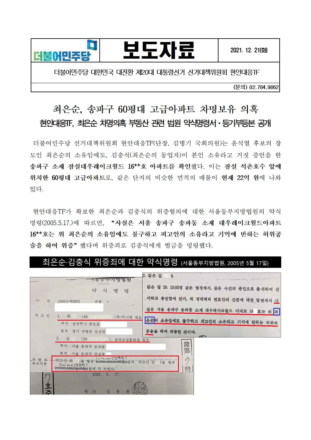 [보도자료] 더불어민주당 선대위 현안대응TF, 최은순 송파구 60평대 고급아파트 차명보유 의혹 관련 법원 약식명령서 등 공개