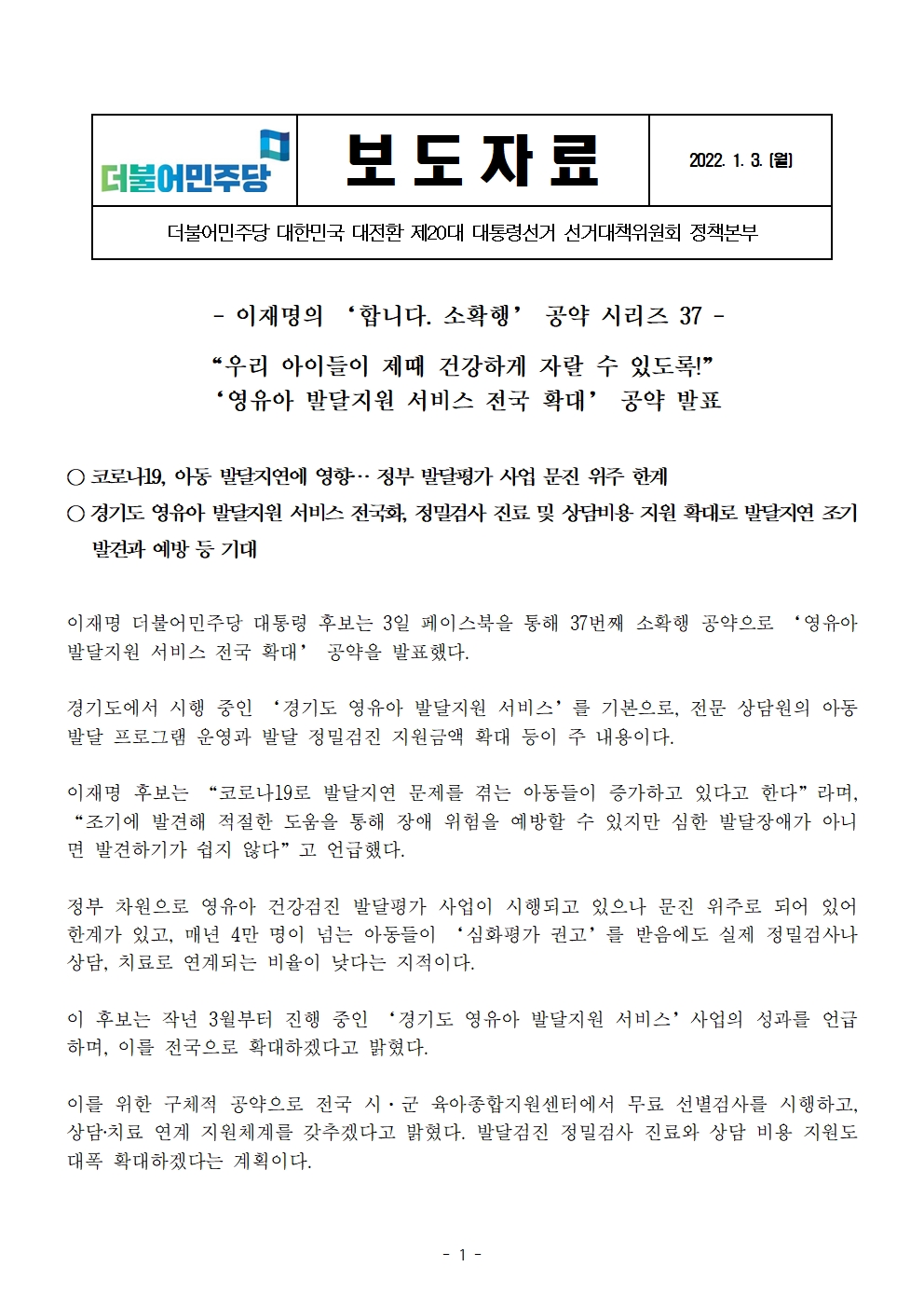 [보도자료] 더불어민주당 선대위 정책본부, '이재명은 합니다. 소확행 공약 시리즈 37' 영유아 발달지원 서비스 전국 확대 공약