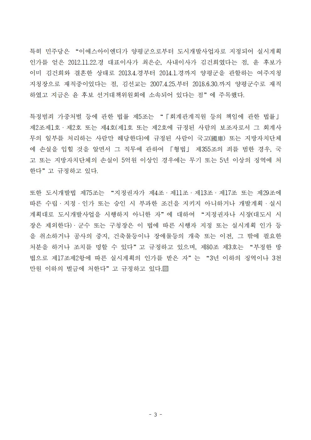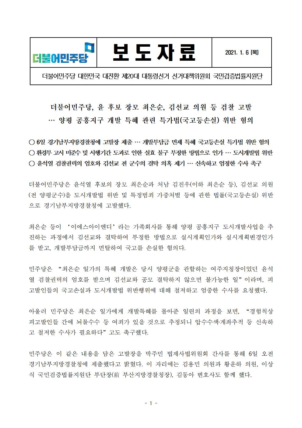 [보도자료] 더불어민주당 선대위 국민검증법률지원단 윤 후보 장모, 최은수, 김선교 의원 등 검찰 고발