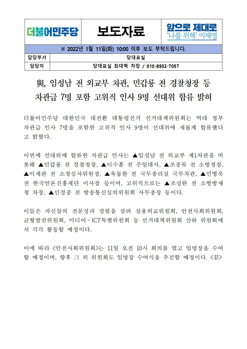 [보도자료] 더불어민주당 선대위 안전사회위원회, 경찰·소방·해경 안전분야 최고전문가 영입