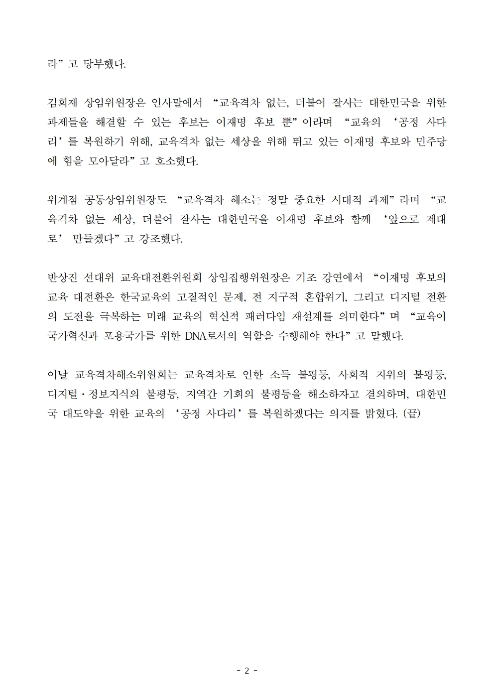 [보도자료] 더불어민주당 선대위 교육격차해소위원회 출범식 개최