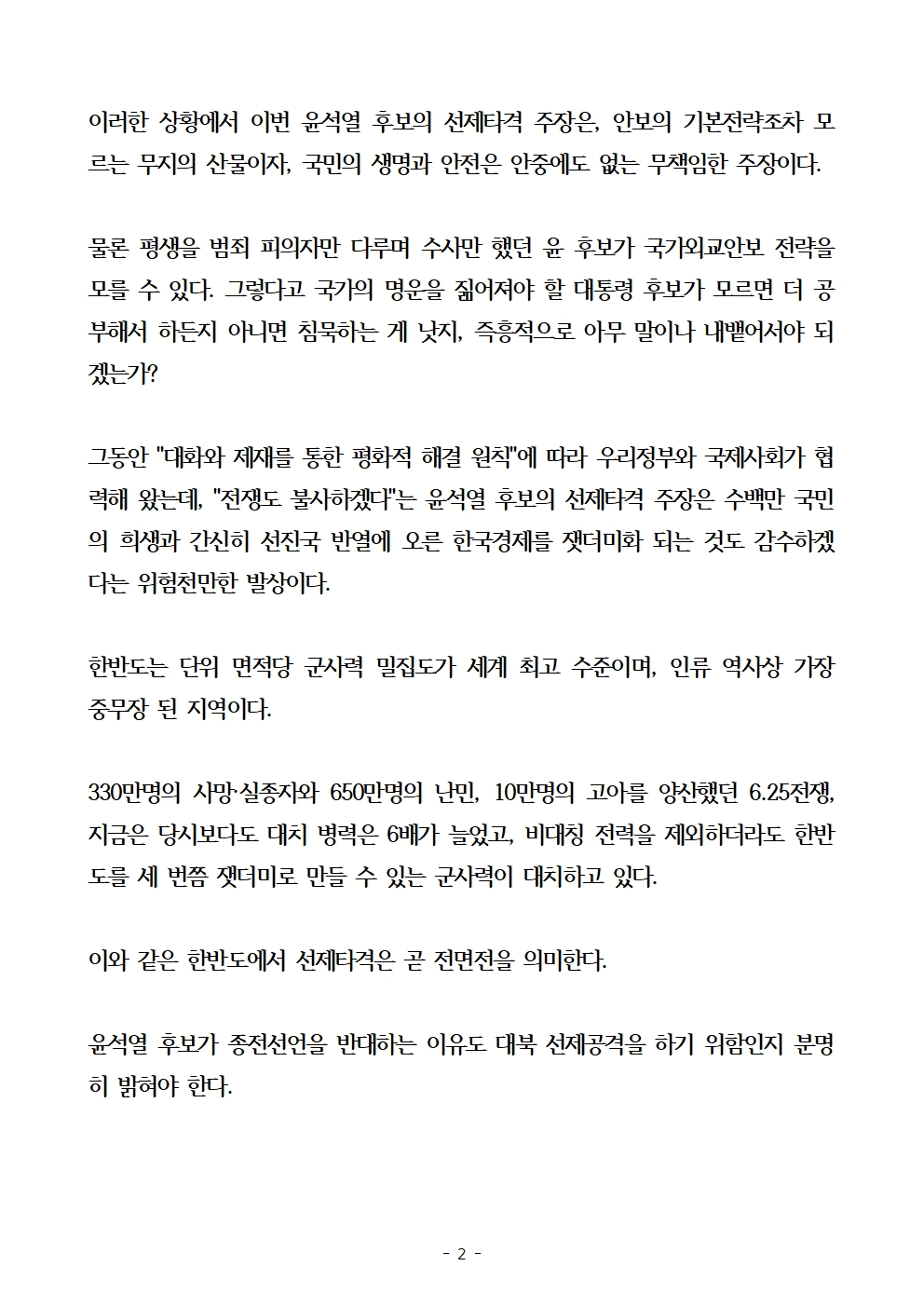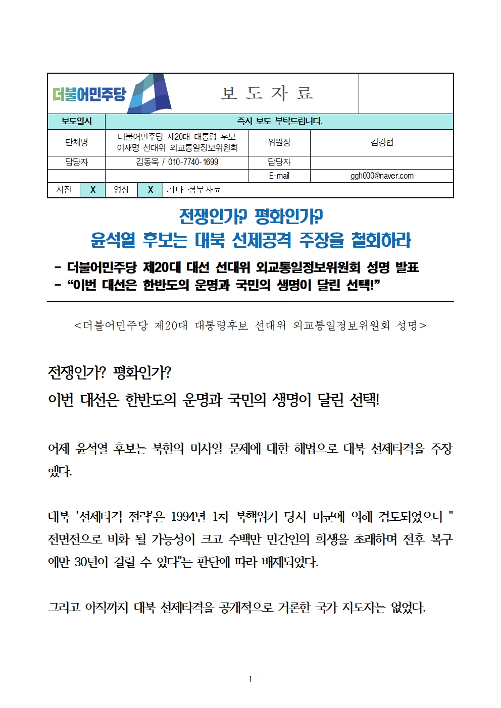[보도자료] 더불어민주당 선대위 외교통일정보위원회, 대북 선제공격 발언 관련 성명