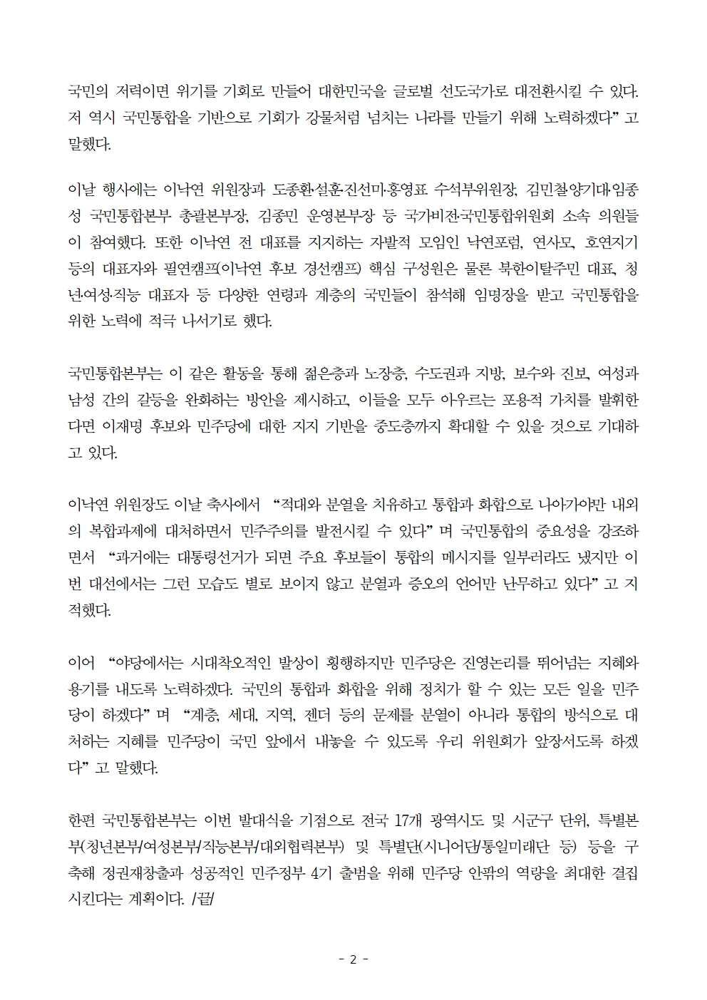 [보도자료] 더불어민주당 선대위 국가비전·국민통합위원회, 국민통합본부 발대식 및 임명장 수여식 개최