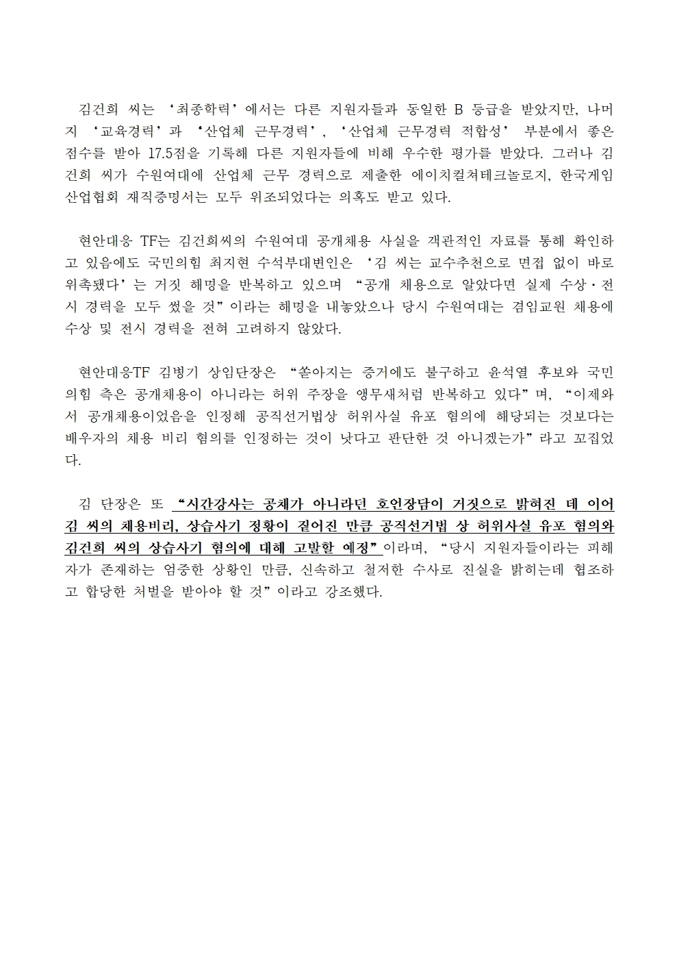 [보도자료] 더불어민주당 선대위 현안대응TF, 김건희 씨 수원여대 공개채용 서류심사결과표 공개
