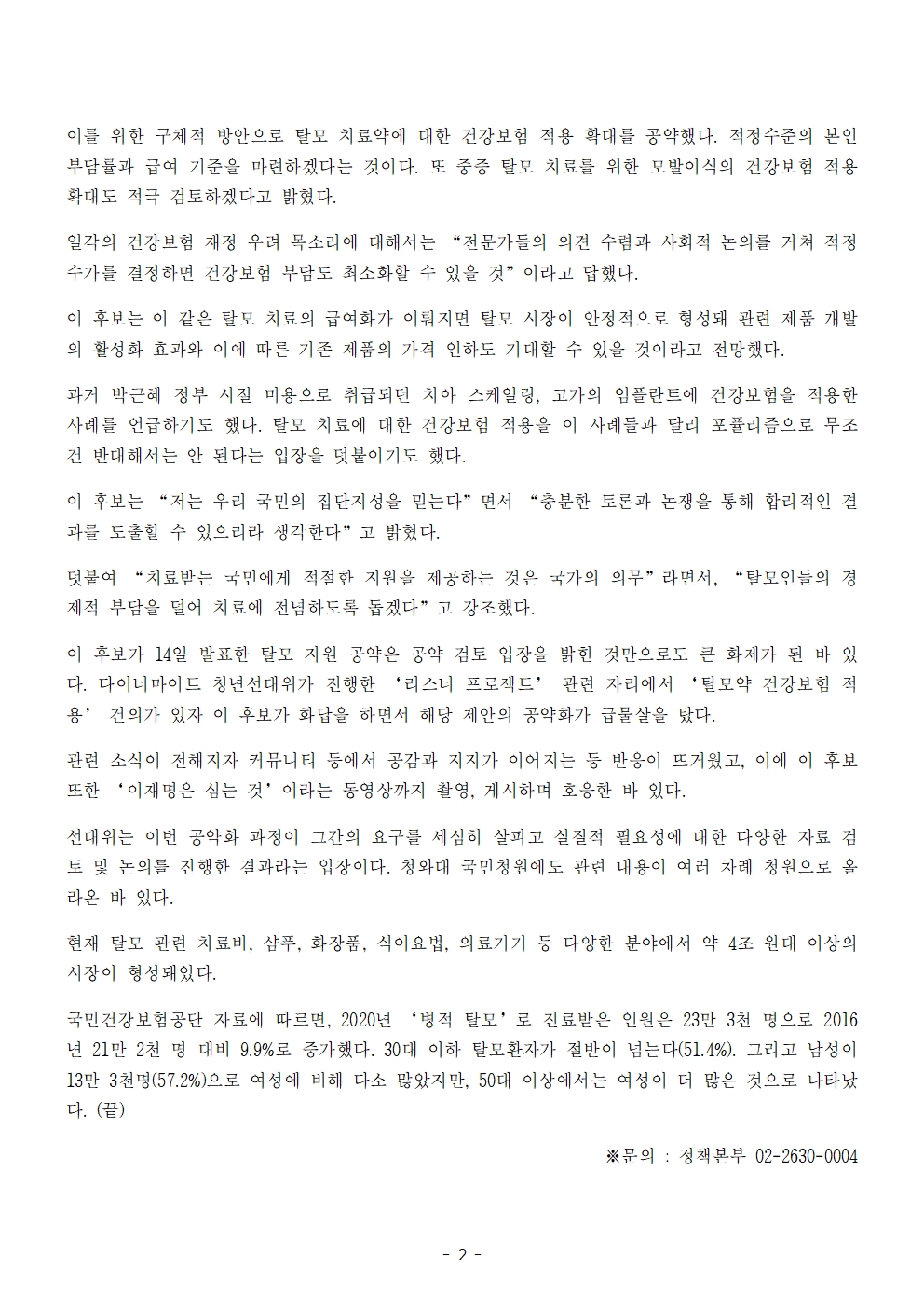[보도자료] 더불어민주당 선대위 정책본부, '이재명은 합니다. 소확행 공약 시리즈 46' 탈모치료 건강보험 적용 확대 공약