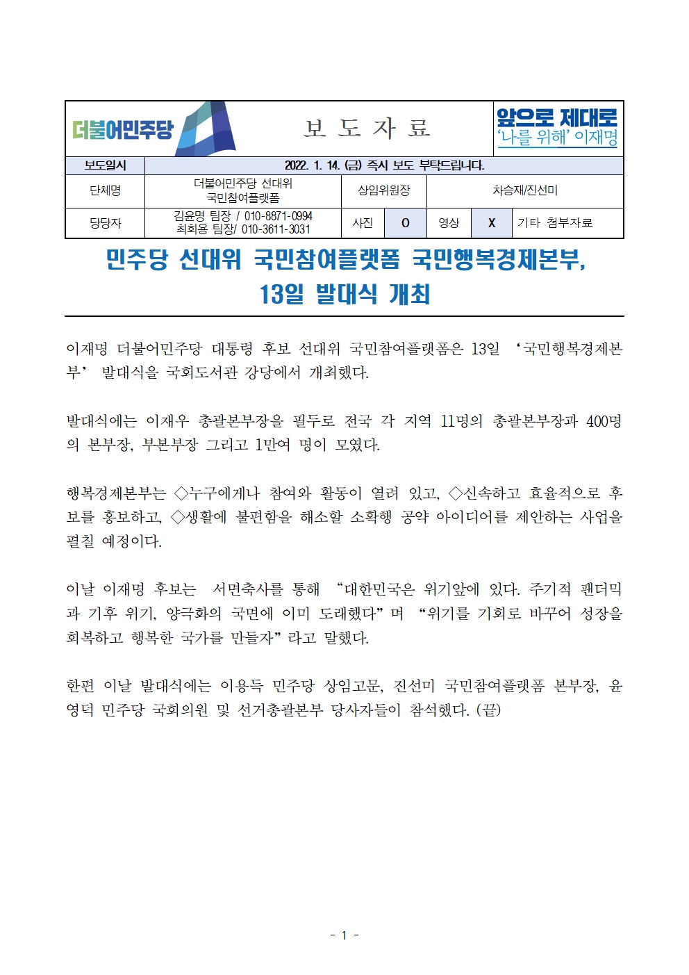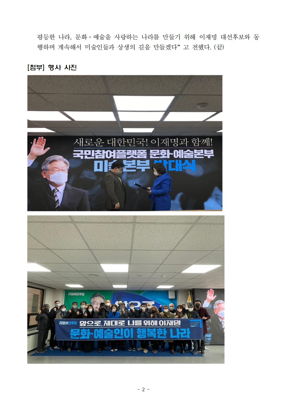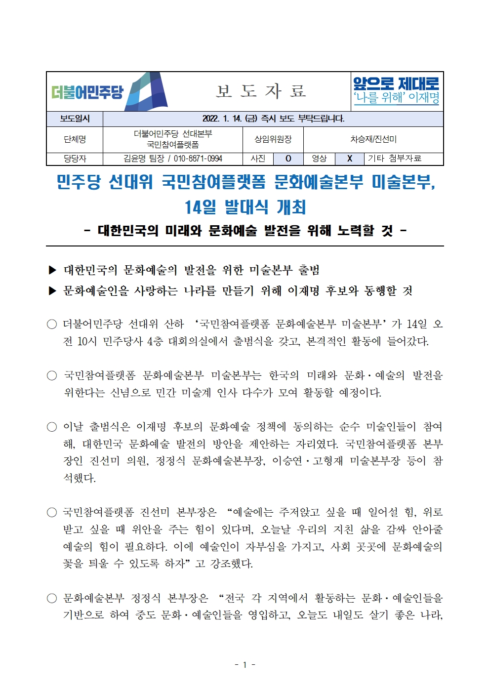 [보도자료] 더불어민주당 선대위 국민참여플랫폼, 문화예술본부 미술본부 및 국민행복경제본부 발대식 개최