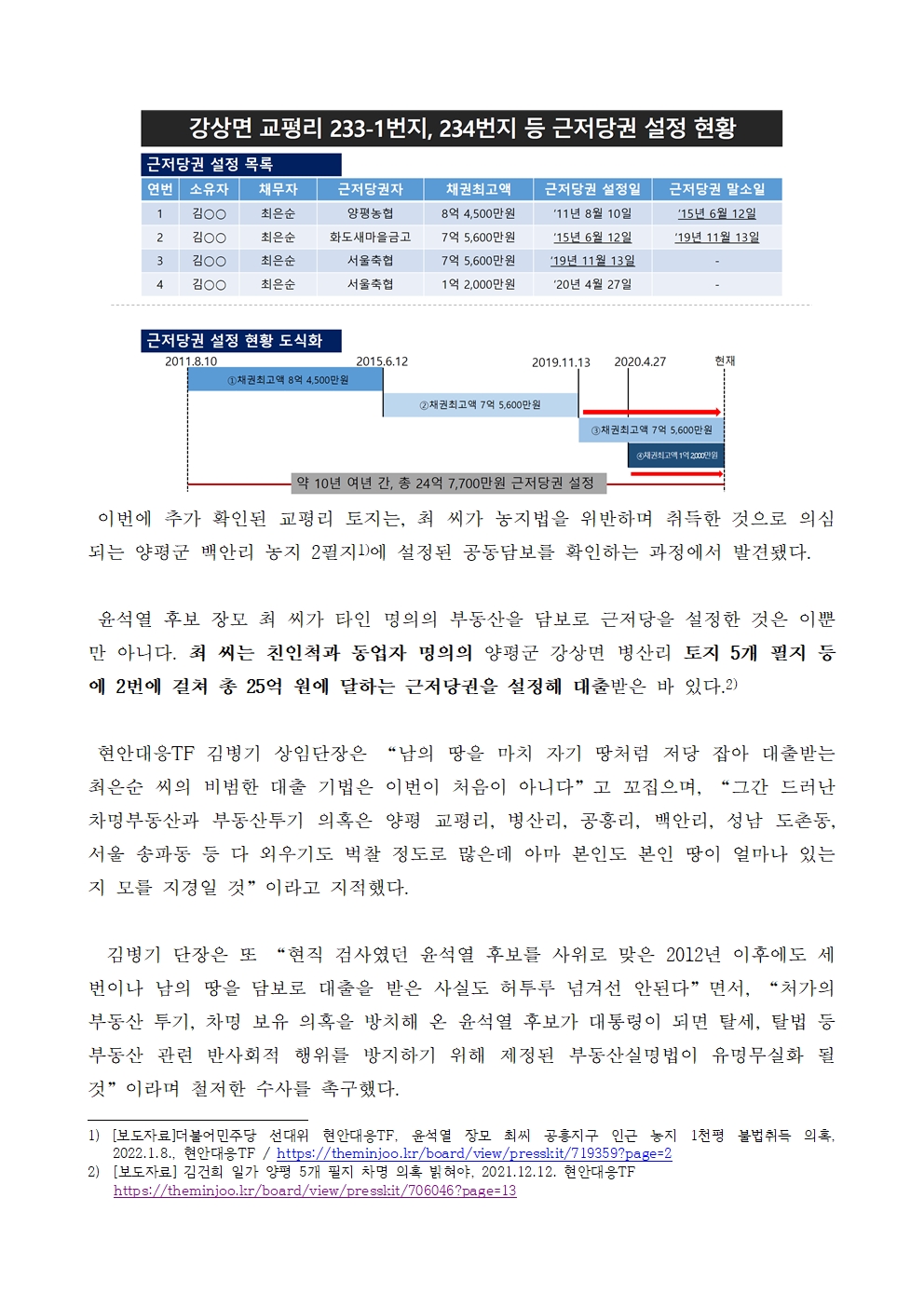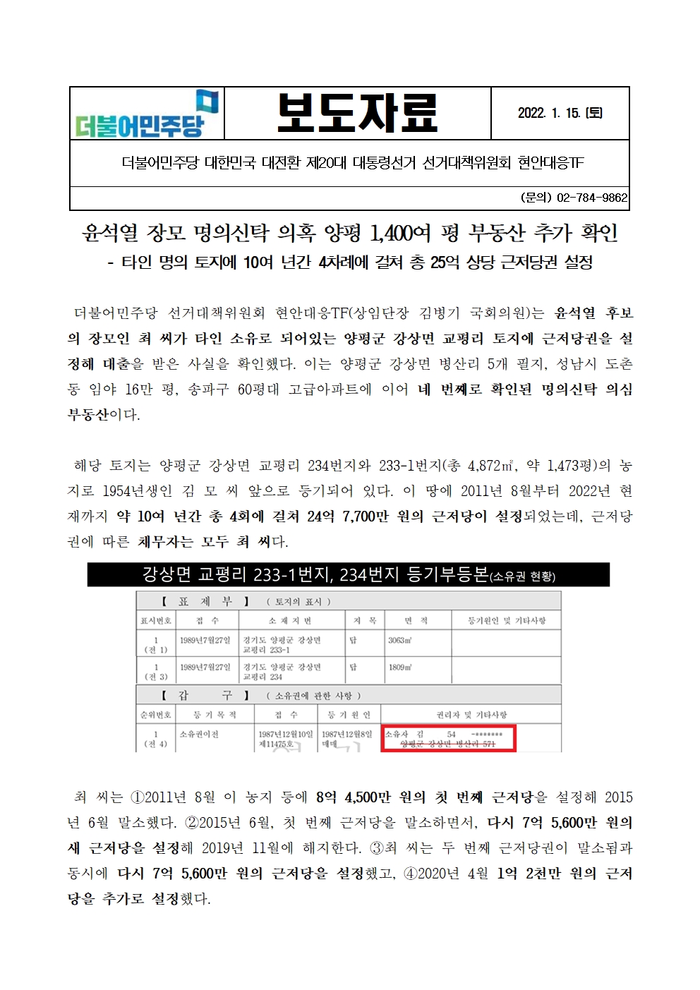 [보도자료] 더불어민주당 선대위 현안대응TF, 윤석열 장모 명의신탁 의혹 양평 1,400여 평 부동산 추가 확인