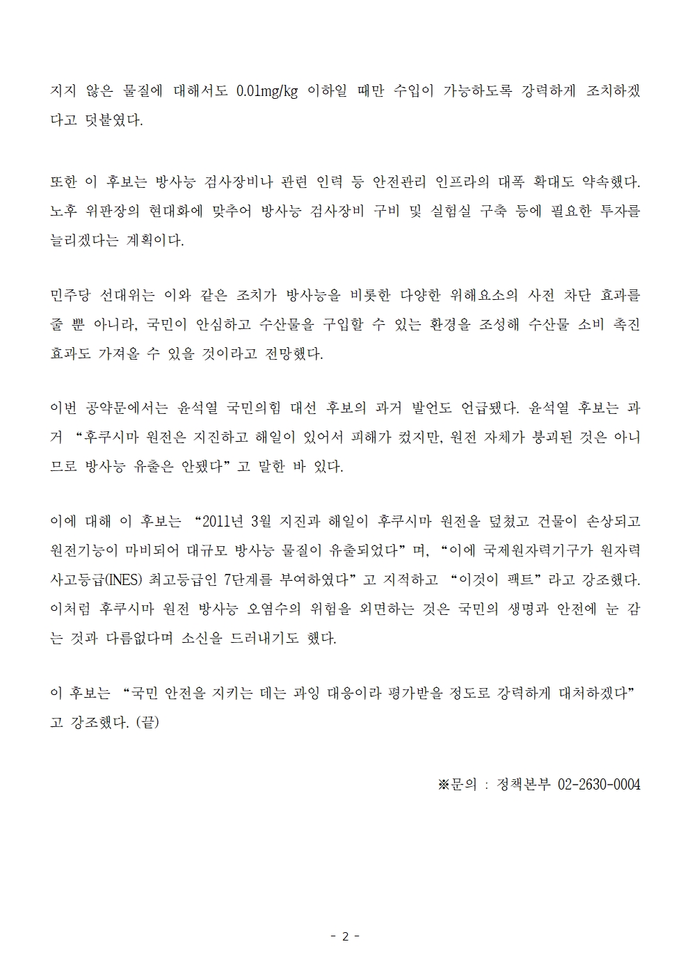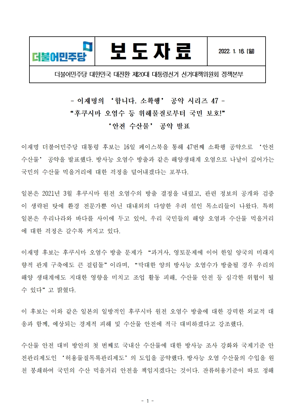 [보도자료] 더불어민주당 선대위 정책본부, '이재명은 합니다. 소확행 공약 시리즈 47' 안전 수산물 공약