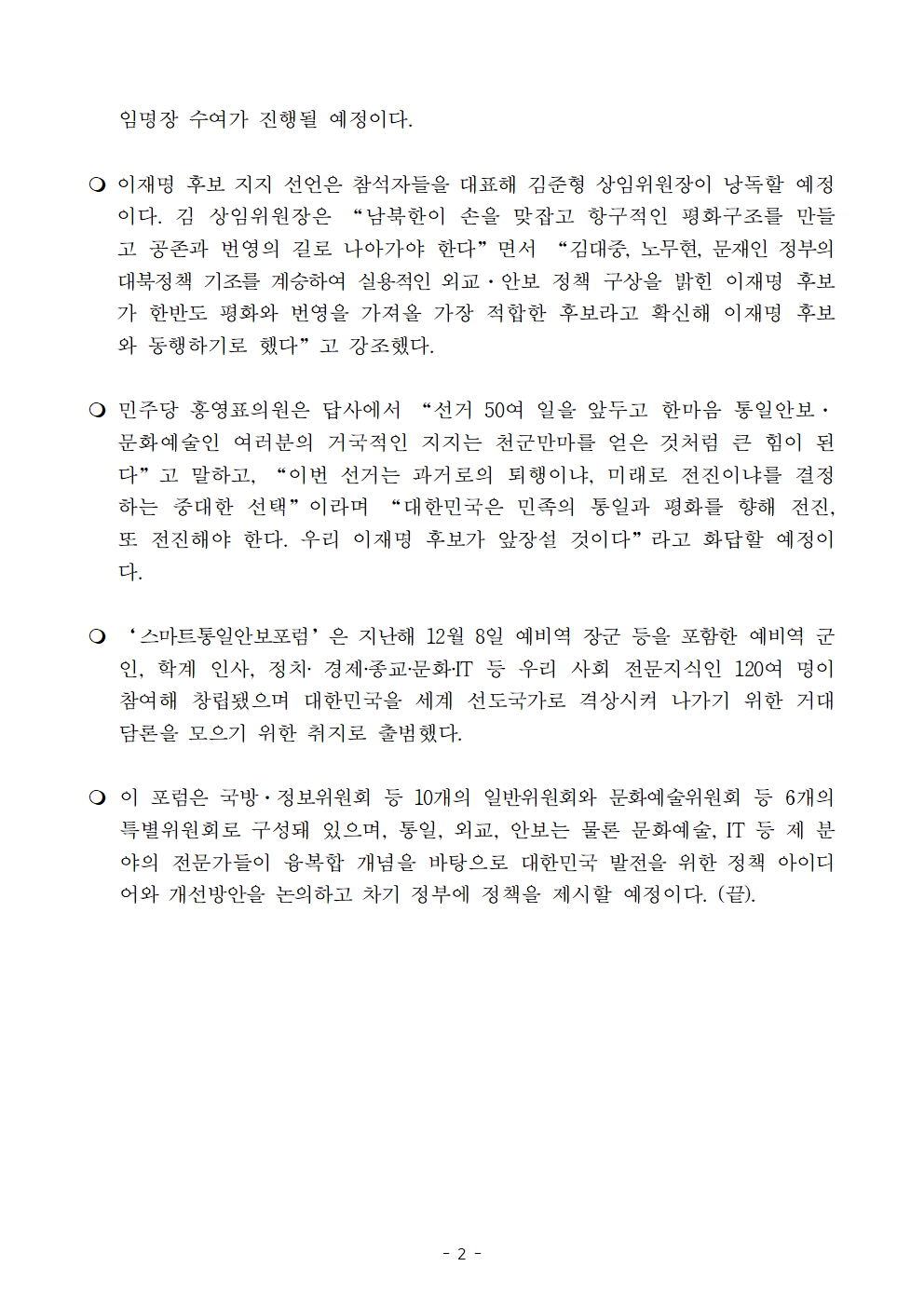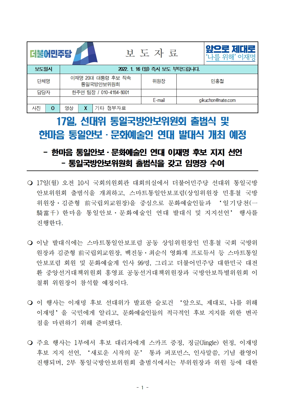 [보도자료] 더불어민주당 선대위 통일국방안보위원회 출범식 및 한마음 통일안보·문화예술인 연대 발대식 개최