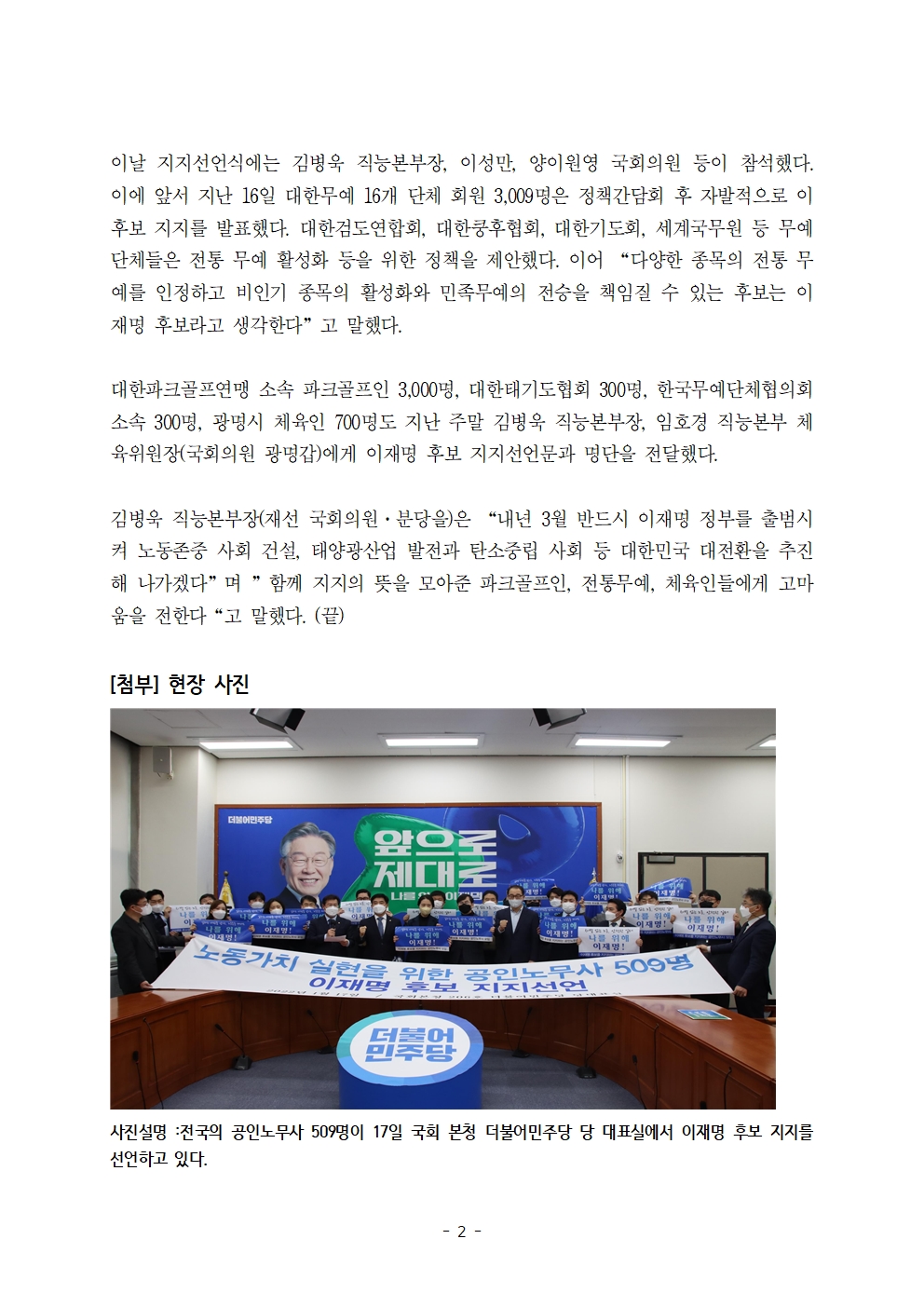 [보도자료] 더불어민주당 선대위 직능본부, 공인노무사, 태양광사업자, 파크골프, 체육, 무예인 등 지지선언