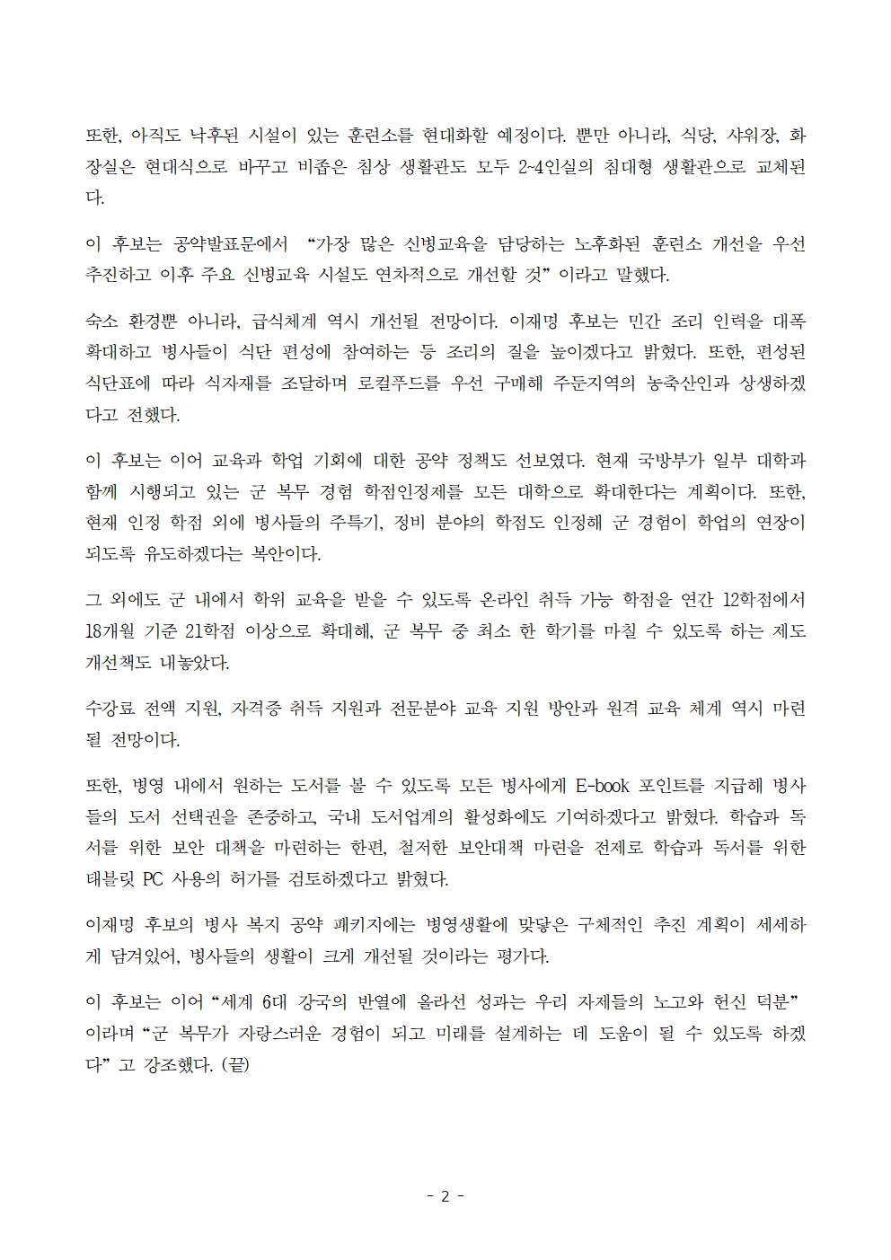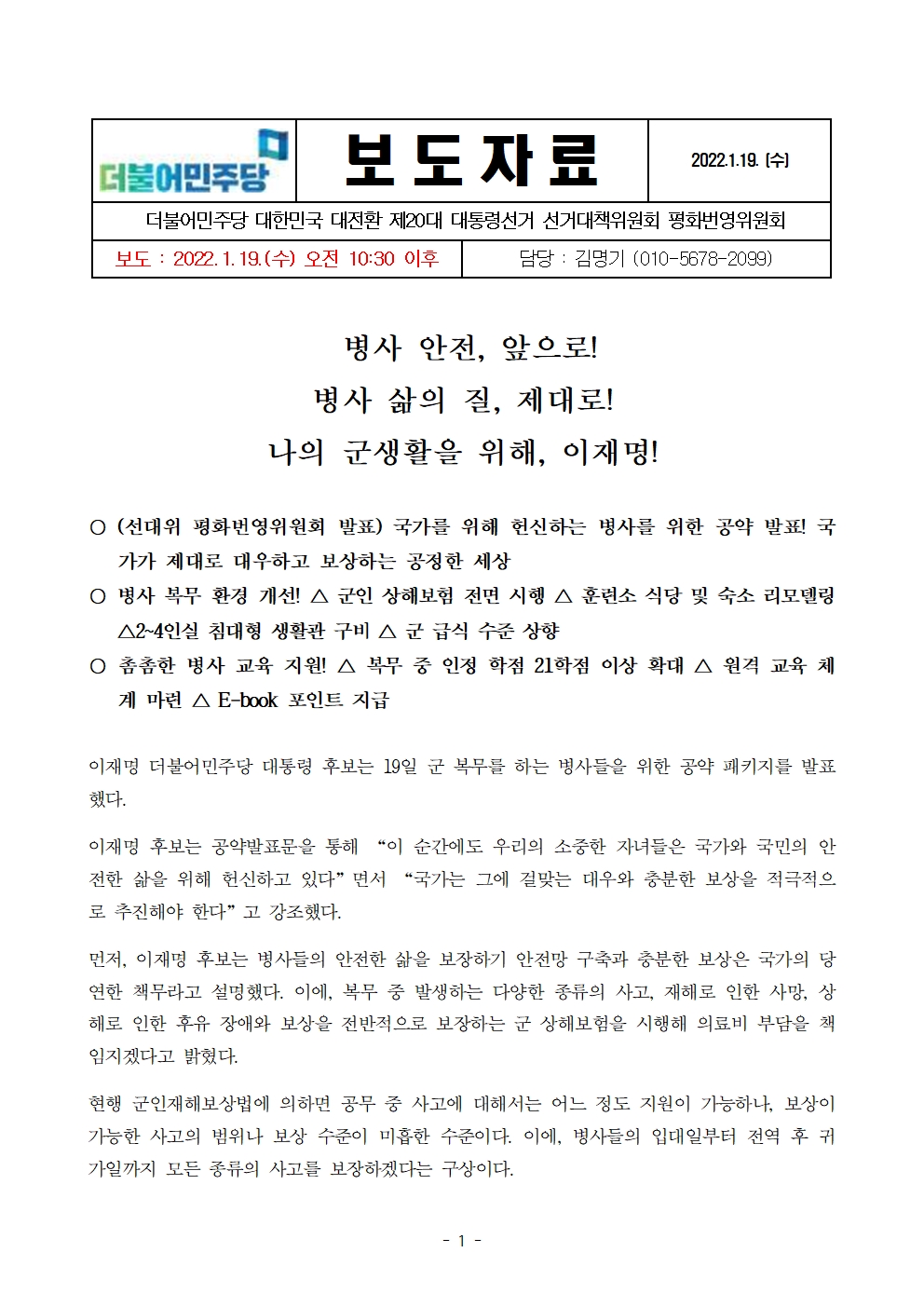[보도자료] 더불어민주당 선대위 평화번영위원회, 병사 복지공약 발표