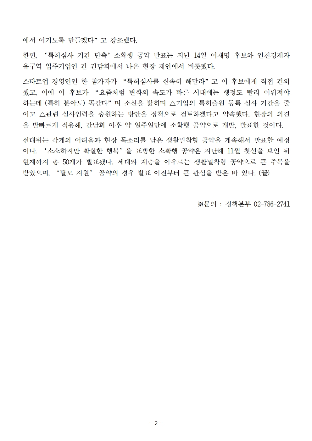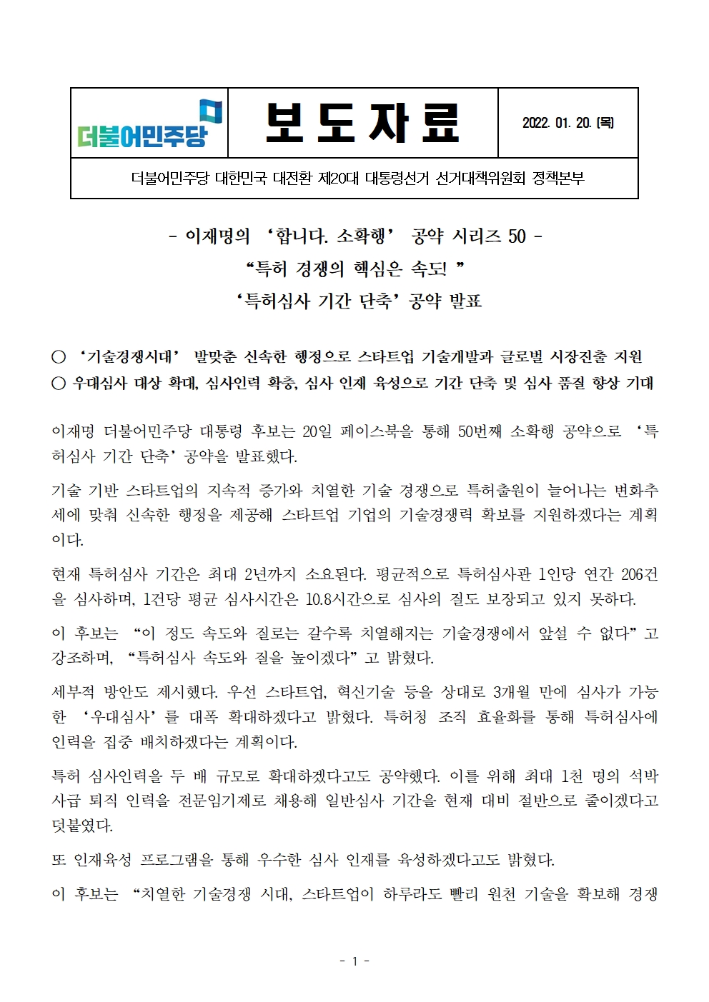 [보도자료] 더불어민주당 선대위 정책본부, '이재명은 합니다. 소확행 공약 시리즈 50' 특허심사 기간 단축 공약