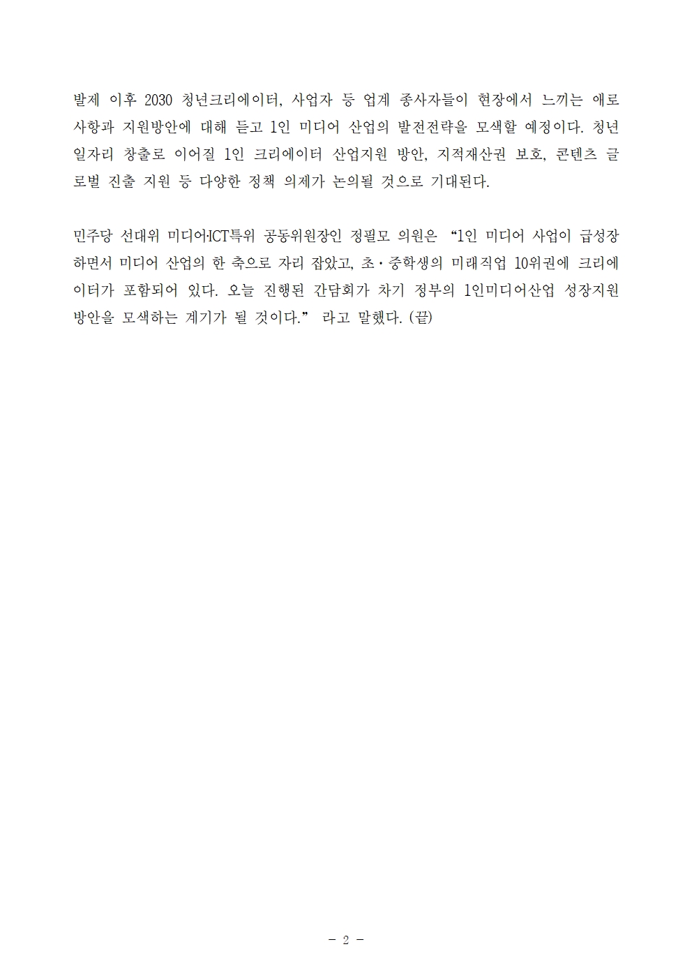 [보도자료] 더불어민주당 선대위 미디어·ICT특별위원회 '1인미디어산업 성장을 위한 정책제안 간담회' 개최
