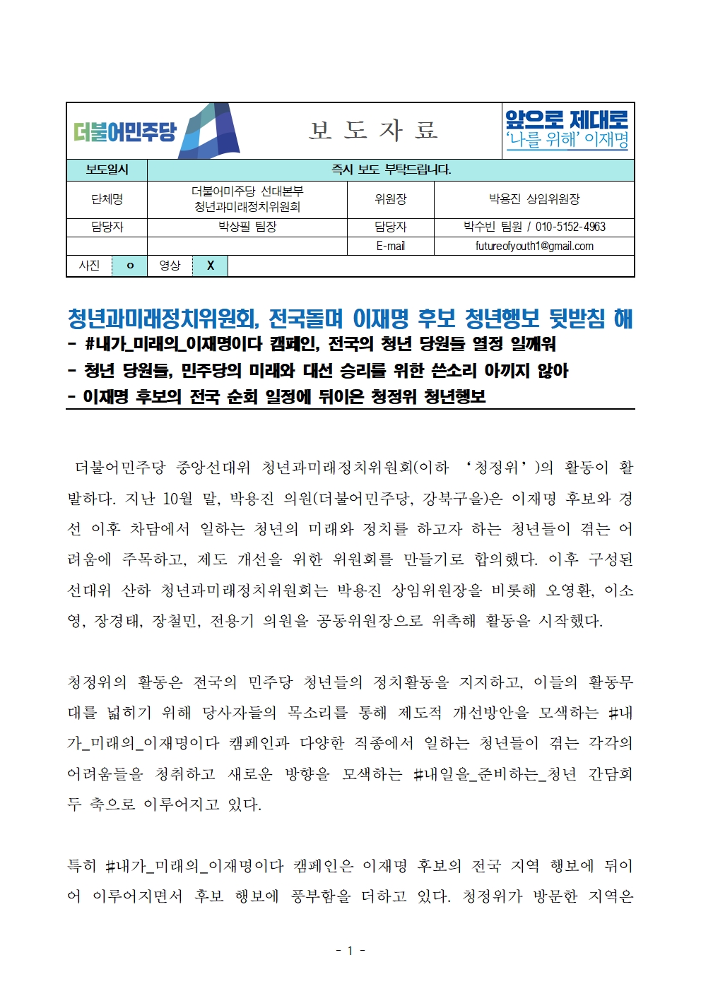 [보도자료] 더불어민주당 선대위 청년과미래정치위원회, '#내가_미래의_이재명이다' 캠페인 전국순회