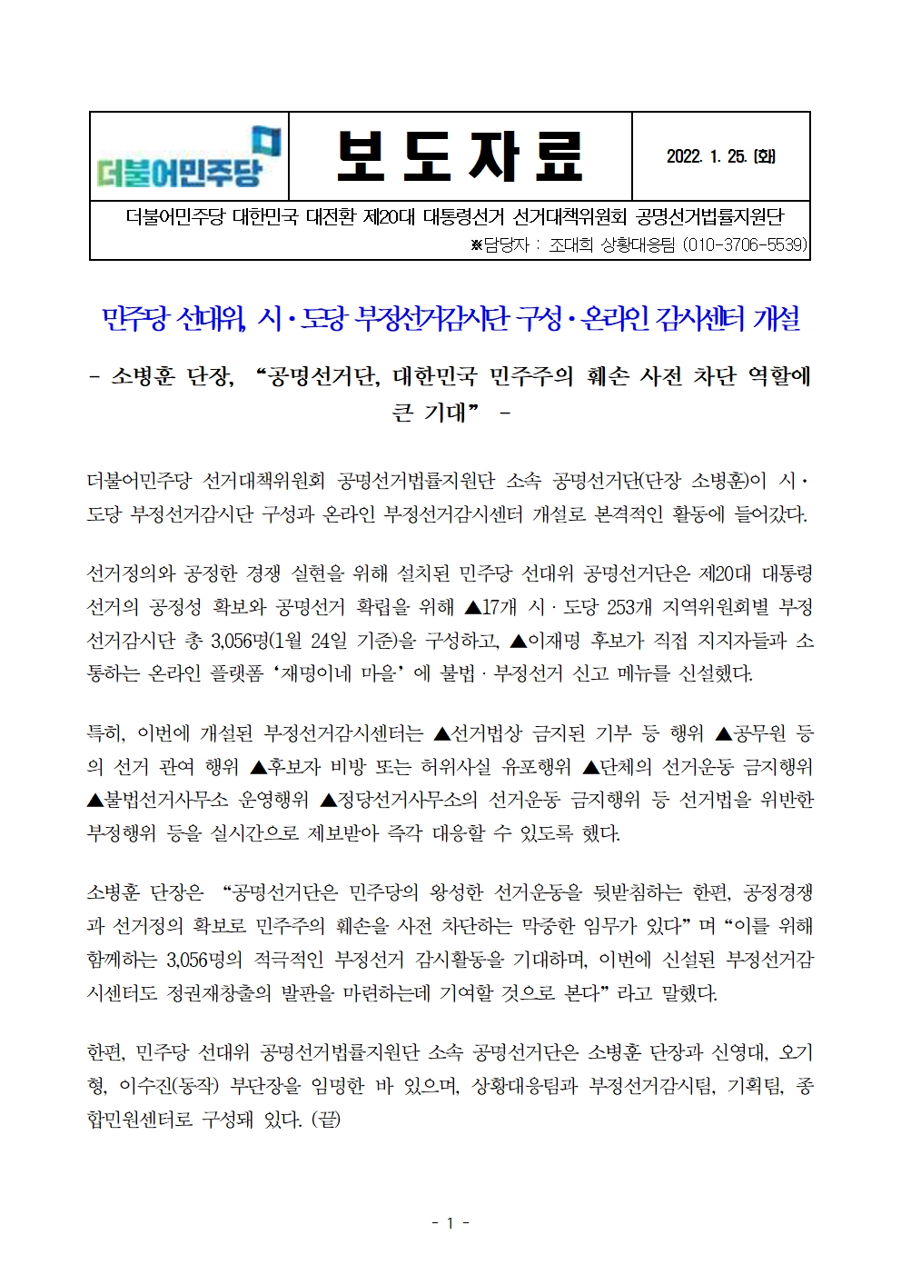 [보도자료] 더불어민주당 선대위 공명선거법률지원단, 시·도당 부정선거감시단 구성 및 온라인 감시센터 개설