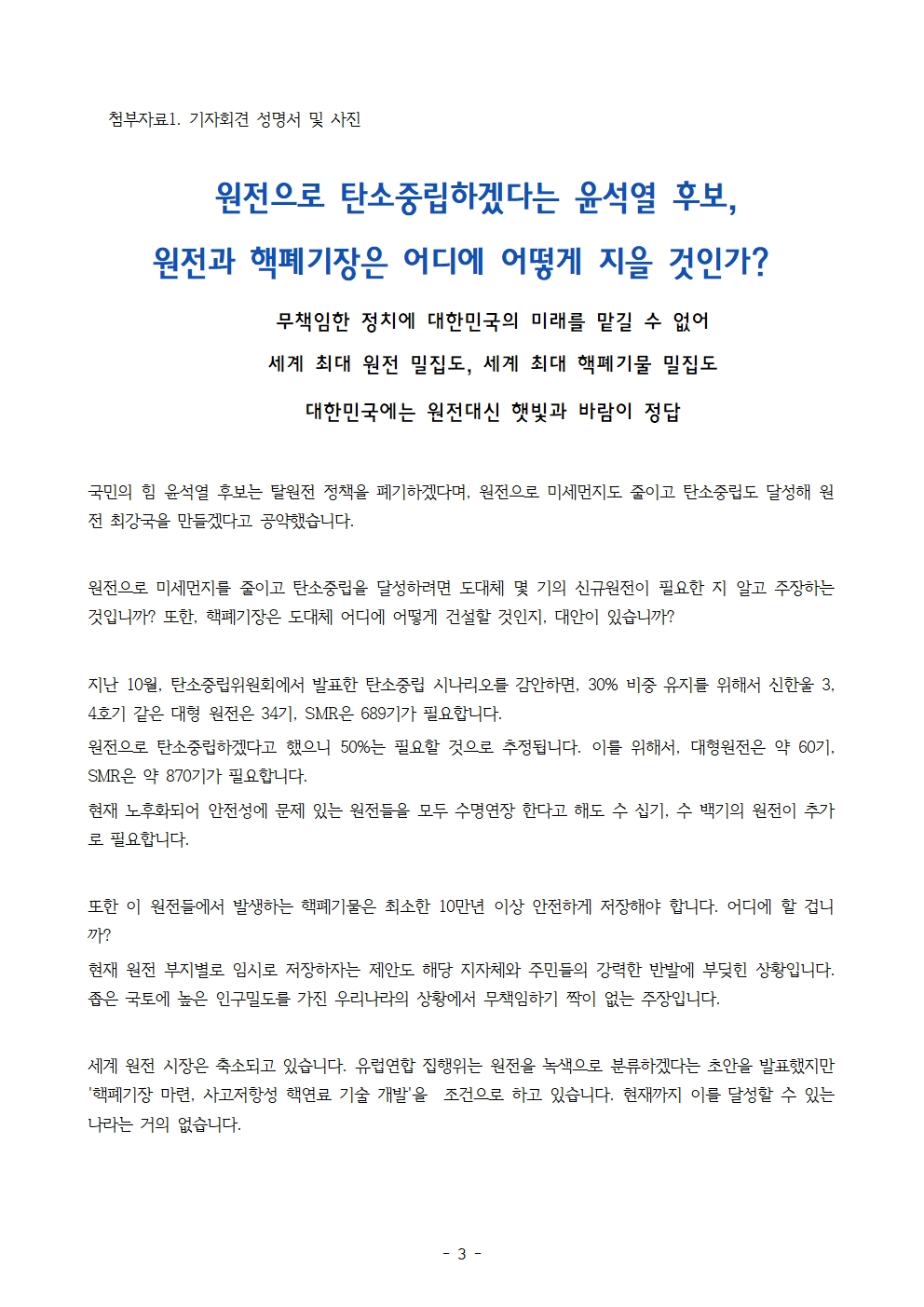 [보도자료] 더불어민주당 선대위 기후위기탄소중립위원회, 탈원전 정책 폐기 공약 비판 기자회견
