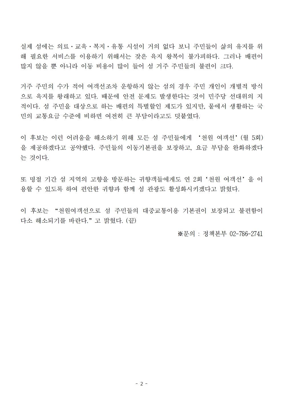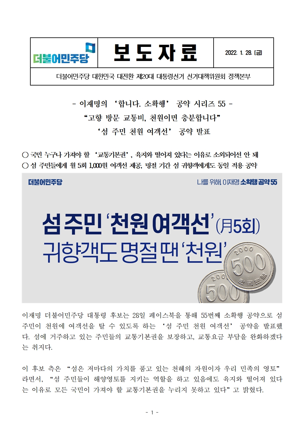[보도자료] 더불어민주당 선대위 정책본부, '이재명은 합니다. 소확행 공약 시리즈 55' 섬 주민 천원 여객선 공약 발표