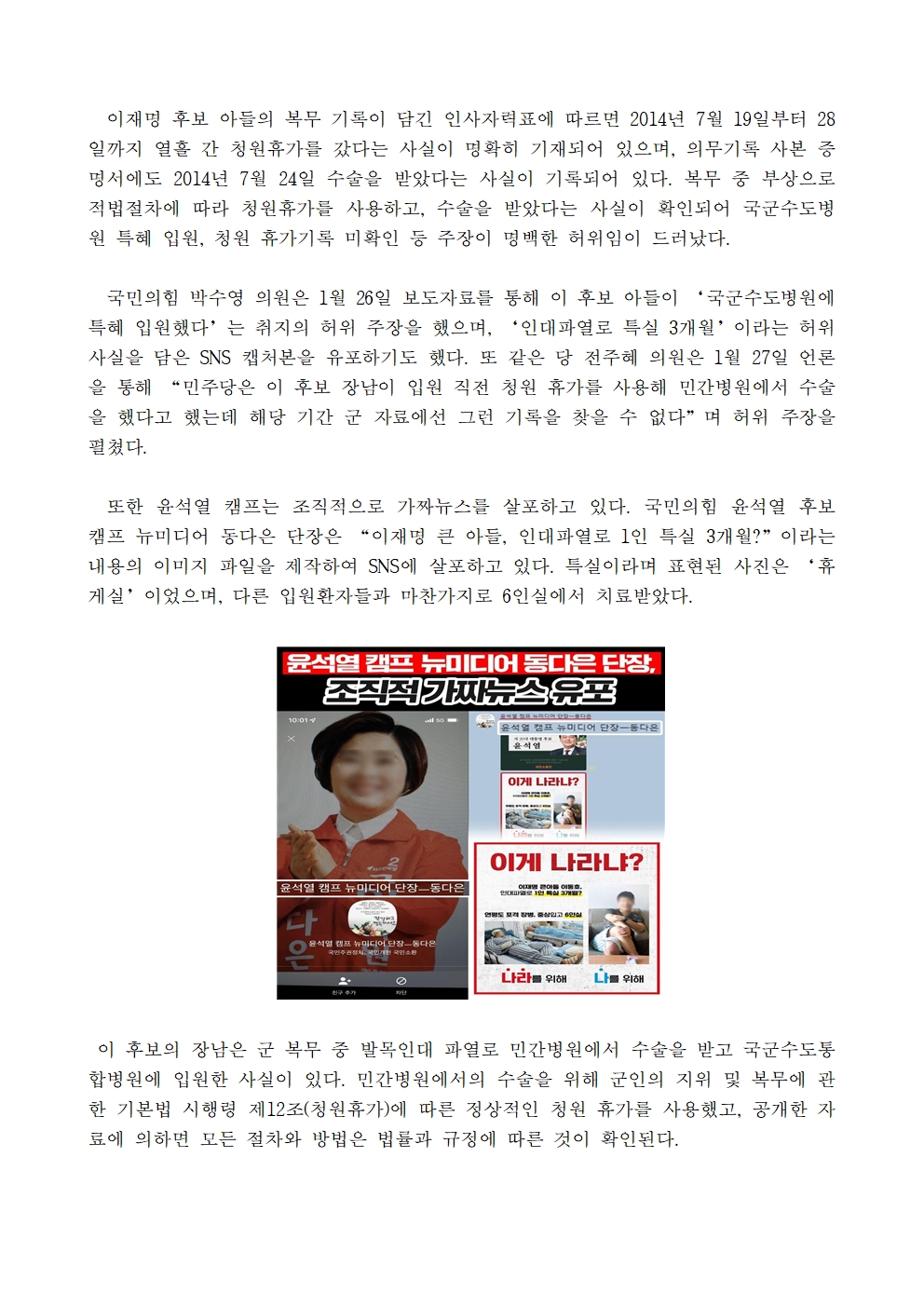 [보도자료] 더불어민주당 선대위 현안대응TF, 이재명 후보 장남 군 복무 중 입원 관련 국민의힘 조직적 가짜뉴스 살포 증거 공개