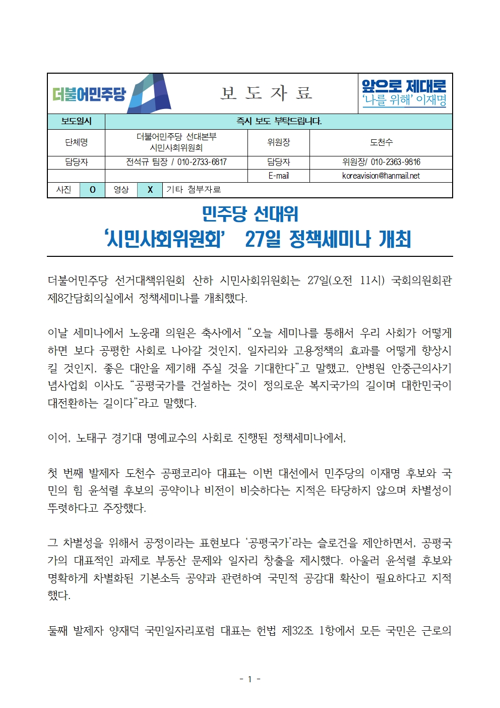 [보도자료] 더불어민주당 선대위 시민사회위원회, 정책세미나 개최