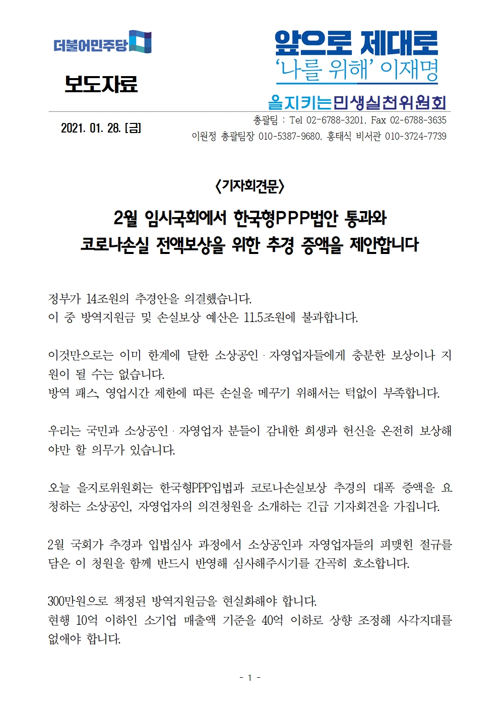[보도자료] 더불어민주당 선대위 을지키는민생실천위원회, 한국형PPP 도입 및 코로나손실 전액보상 추경 증액 제안