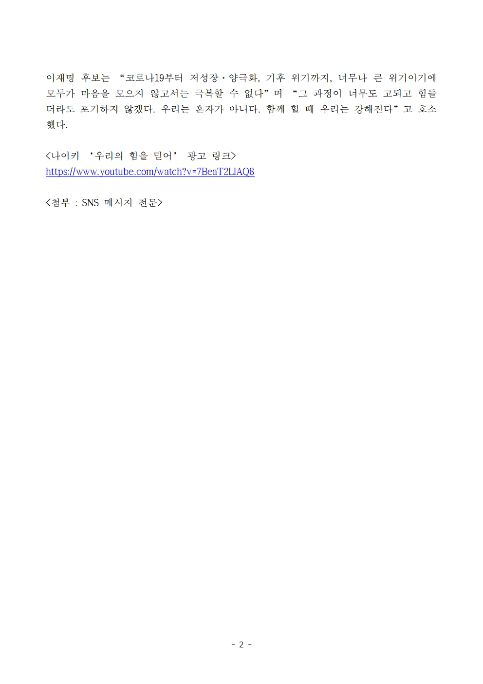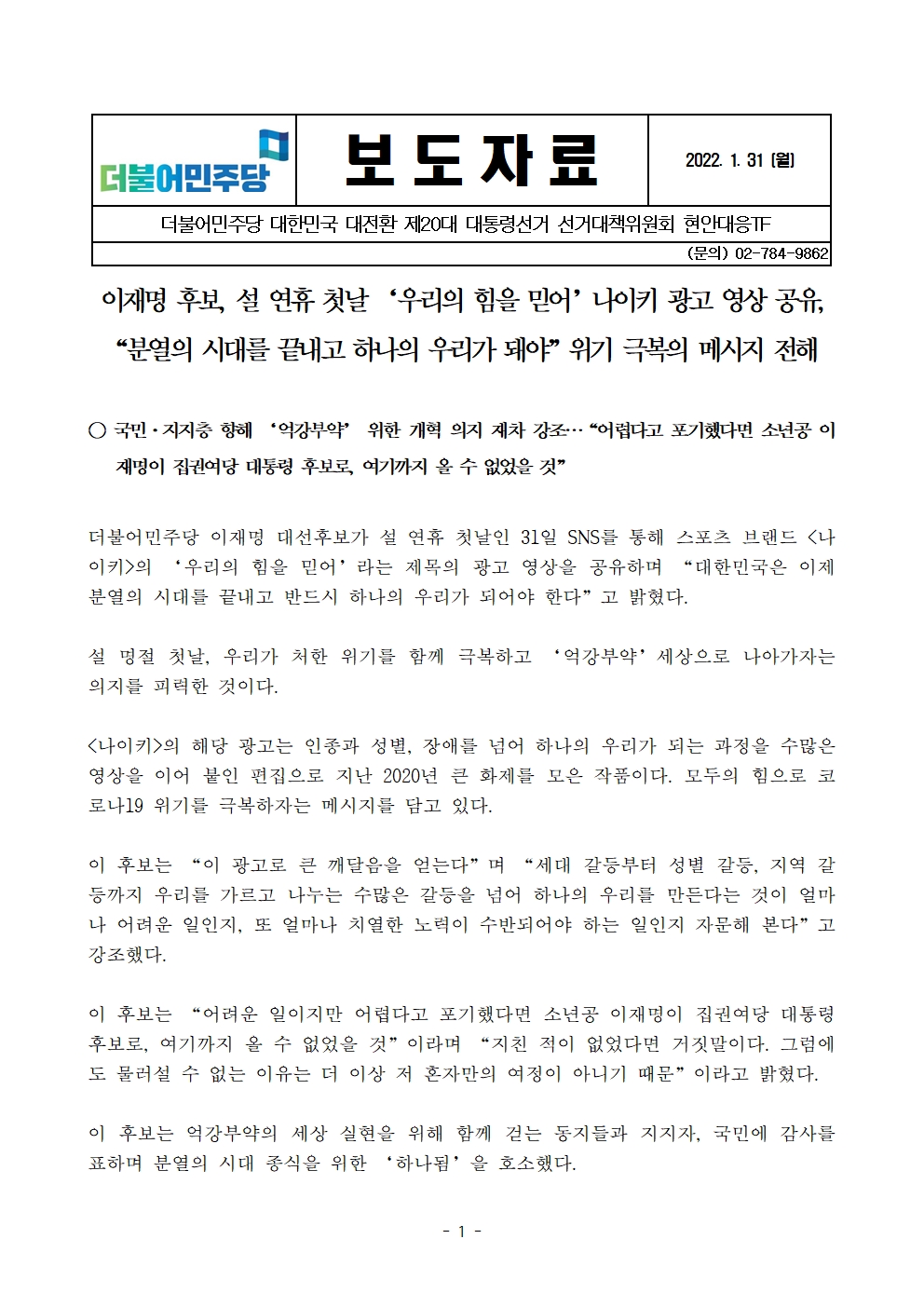 [보도자료] 더불어민주당 선대위 현안대응TF, 이재명 후보, 설 연휴 첫날 '우리의 힘을 믿어' 나이키 광고 영상 공유, 위기 극복 메시지 전해