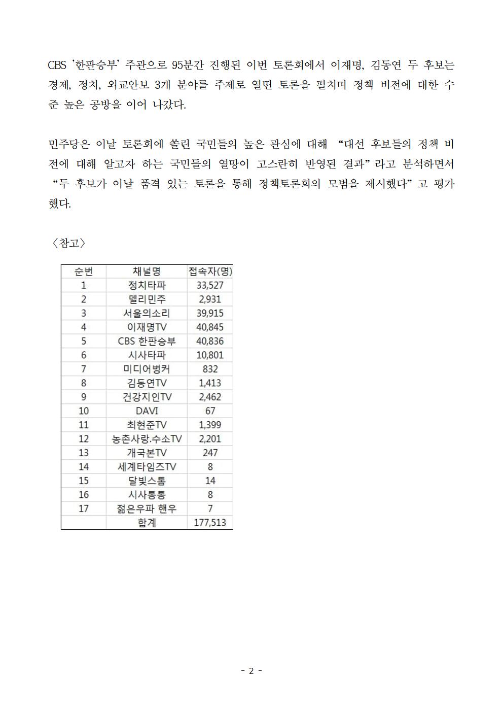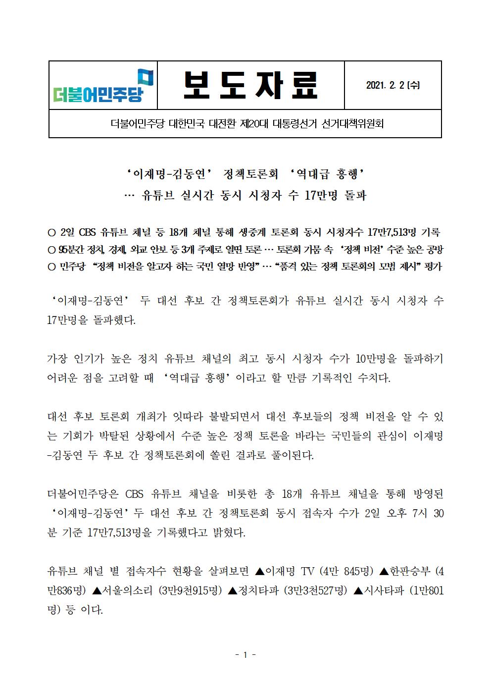 [보도자료] 더불어민주당 선대위 ‘이재명-김동연’ 정책토론회 ‘역대급 흥행’ 유튜브 실시간 동시 시청자 수 17만명 돌파